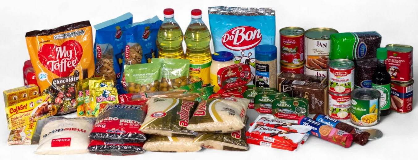4 KG Arroz Blanco grano largo Disempre 2 KG Frijol Negro Bolsa 1kg Rico Prato 4 Alubia Roja Bolsa 500 g Cister 1 KG Azúcar Blanca Maisdoce 2 U Pasta de Tomate 400 g Abre Fácil HollandPark 2 U Pasta Pena Galo 500 g 2 U Pasta espagueti Sarbio 500 g 2 Lt Aceite Sumavi 2 U Leche Condensada Lata 390 g HollandPark 1 U Preparado Leche en Polvo entera Dobon 1 kg caja x 10 unid 1 U Mayonesa 500 ml HollandPark 2 U Salsa Soya tradicional Kikoman 250 ml 1 U Sazonador Completo 335 g Bote Carmencita 1 U Caldo de Carne pastilla x 10 g (estuche 12 pastillas) Calnort 1 U Caldo de Pollo pastilla x 10 g (estuche 12 pastillas) Calnort 1 U Caldo Sabor Jamón pastilla x 10 g (estuche 12 pastillas) Calnort 3 U Sardinas en aceite 3 U Sardinas en tomate 1 U Pork Luncheon Meat Lata 320 g Pampeano 2 U Refresco El Ricote de limón 2 U Refresco El Ricote de piña 2 U Café Molido Natural 250 g Purasangre 1 U Chorizo en manteca 1 U Corned Beef Lata 340 g Pampeano 1 U Morcilla con manteca 625 g JAN 2 U Aceitunas S/Hueso Covirán Bolsa 160 g Esc. 70 g 1 U Maíz Dulce Coaliment 425 ml / 340 g 1 U Malta Van Pur Six pack Lata 33 cl caja x 4 packs 1 U Caramelo My Toffee Leche c/Choco 500 g Bolsa Riclan 1 U Galletas con Crema de Chocolate 112 g Renata 1 U Galletas con Crema de Fresa 112 g Renata 4 U Chocolate Kinder T1 x 24 x 8 12.5 g Ferrero