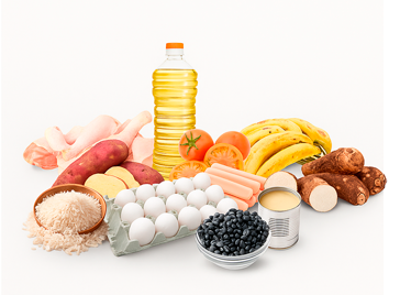 Huevos (15 ud.) Leche condensada (390 g Aprox.) Frijol Negro (1 lb) Arroz (5 lb) Malanga (2 lb) Boniato (2 lb) Tomate (2 lb) Plátano Fruta (1 Mano) Aceite (1 L) Pollo (2 lb) Salchichas (340 g)