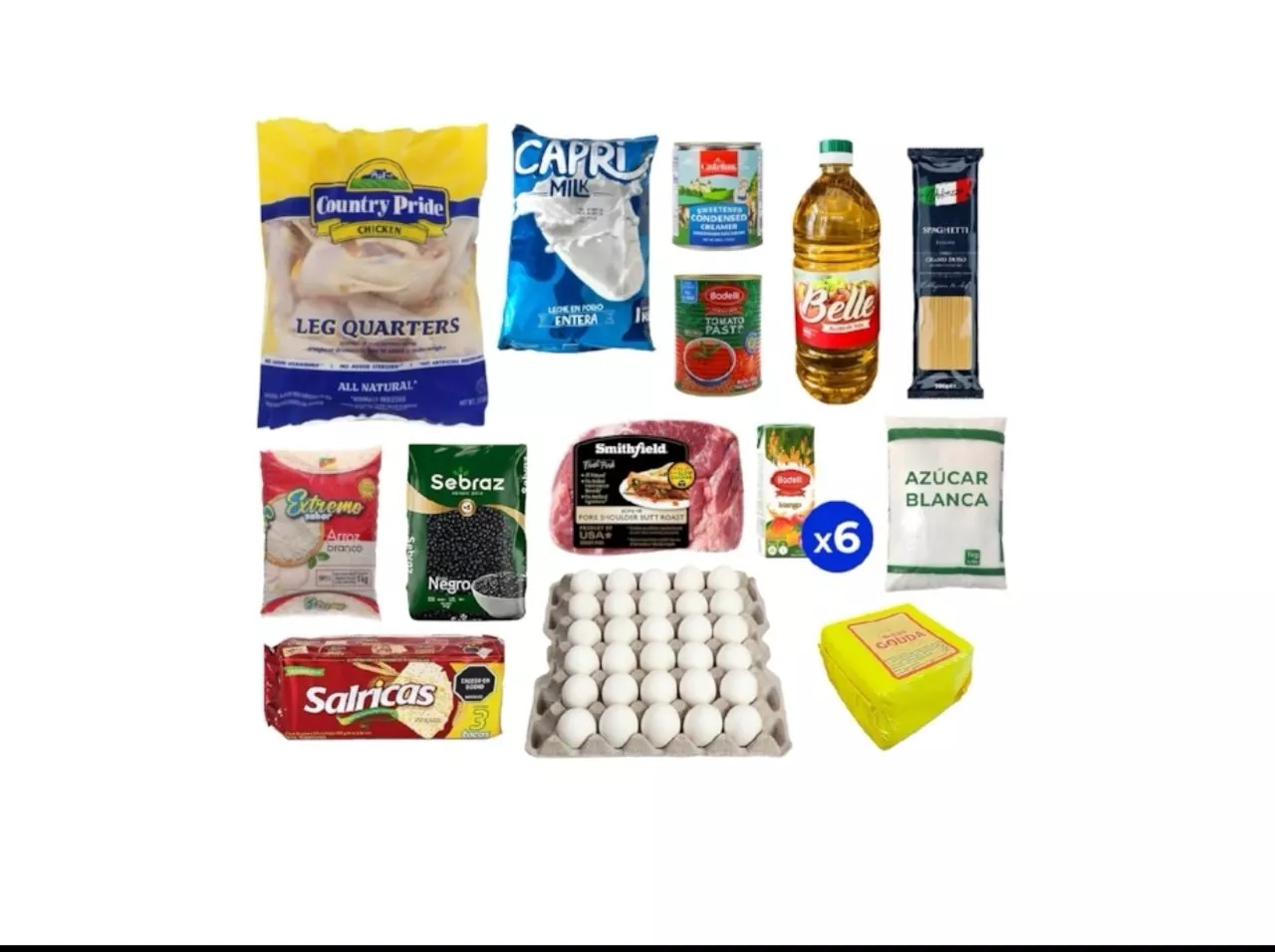 Muslo y contramuslo de pollo 10 lb 1, Leche en polvo entera 1 kg 1, Leche condensada 390 g 1, Aceite 900 ml 1, Pasta de tomate 400 g 1, Spaguetti 1, Arroz brasileño 1 kg 1, Frijol negro 1 kg 1, Paleta de cerdo sin hueso 2.2 lb 1, Néctar de mango 200 ml 6, Galletas de soda 3 tacos 1, Azúcar blanca 1 kg 1, Cartón de huevos 30 unidades 1, Queso Gouda 1 kg 1