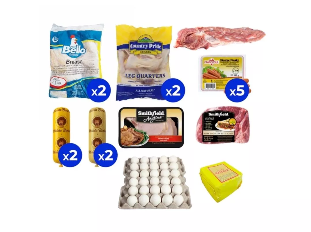 2 Paqt Pechuga entera deshuesada 5.4lb, 2 Paqt Muslo y contramuslo de pollo 10lb, Solomillo de cerdo 2.3 lb, 5 Salchicha de pollo, 2 Picadillo de chorizo 500g, 2 Picadillo de jamon 500 g, Chuleta de cerdo bandeja 2lb, Paleta de cerdo sin hueso 2.2lb, Carton de huevos (30u), Queso Blanco Criollo 4lb