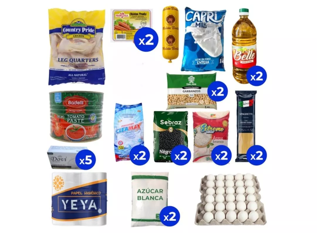 Paqt Muslo y contramuslo de pollo 10lb, 2 Salchicha de pollo, 2 Picadillo de jamon 500g, 2 Leche en polvo entera 1kg, 2 Aceite, Pasta de tomate 2.2 kg, 2 Spaguetti 500g, 2 Arroz brasileño 1kg, 2 Frijol negro 1kg, 2 Garbanzo 1kg, 2 Detergente en Polvo 900g, 5 Jabon Dovi 100g, Papel Higienico 4 rollos, 2 Azucar Blanca 1kg, Carton de huevos (30u)
