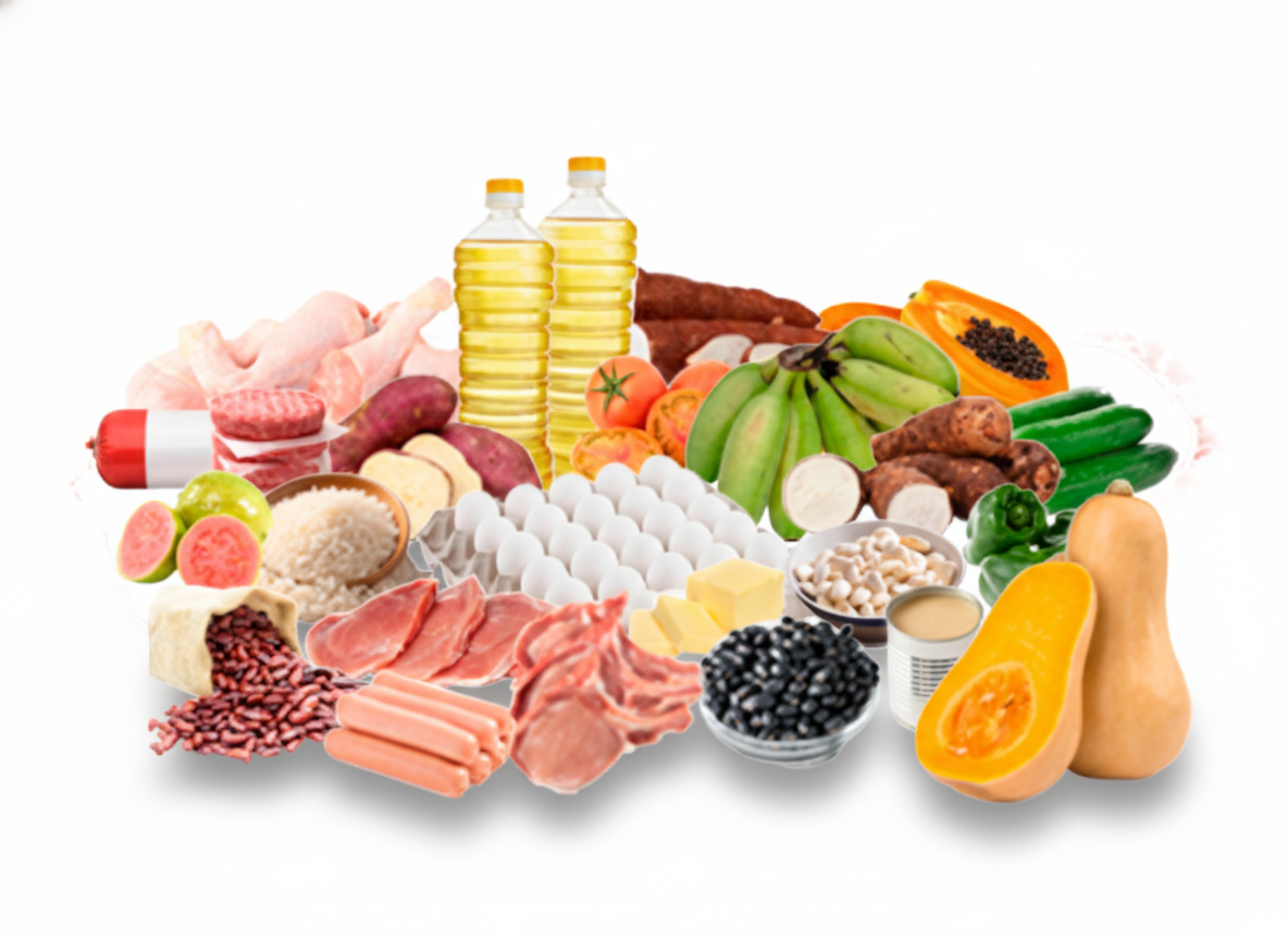Huevos (30 ud.) Mantequilla artesanal (200 g) Leche condensada (390 g Aprox.) Frijol Negro (1 lb) Frijol Colorado (1 lb) Frijol blanco (1 lb) Arroz (15 lb) Malanga (2 lb) Plátano Burro (1 Mano) Calabaza (3 lb) Pimiento (1 lb) Tomate (2 lb) Pepino (1 lb) Guayaba (4 lb) Fruta Bomba (5 lb) Aceite (2 L) Chuletas de Cerdo (2 lb) Bistec de Cerdo (2 lb) Salchichas (10 ud. x 2) Picadillo Mixto (400 g)