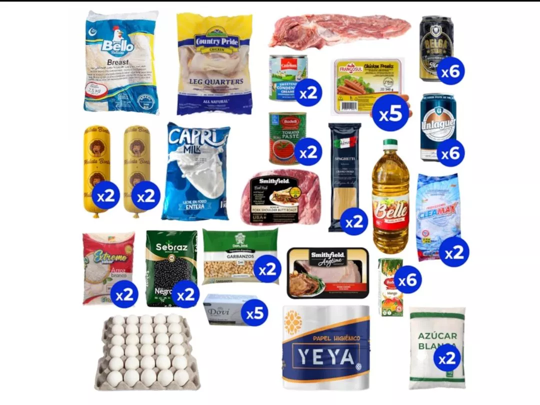 Paqt Pechuga entera deshuesada 5.4lb, Paqt Muslo y contramuslo de pollo 10lb, Solomillo de cerdo 2.3 lb, 5 Paqt Salchicha de pollo, 2 Picadillo de chorizo 500g, 2 Picadillo de jamon 500g, Leche en polvo entera 1kg, 2 Leche condensada 390g, Aceite 900g, 2 Pasta de tomate 400g, 2 Spaguetti 500g, 2 Arroz brasileño 1kg, 2 Frijol negro 1kg, 2 Garbanzo 1kg, Chuleta de cerdo bandeja 2lb, Paleta de cerdo sin hueso 2.2, 6 Nectar de mango 200ml, 6 Cerveza Unlaguer 330ml, 6 Malta belga star, 2 Detergente en Polvo 900g, 5 Jabon Dovi 100g, Papel Higienico 4 rollos, 5 Galletas de sodas 3 tacos, 2 Azucar Blanca 1kg, Carton de huevos (30u), Queso Gouda 1Kg