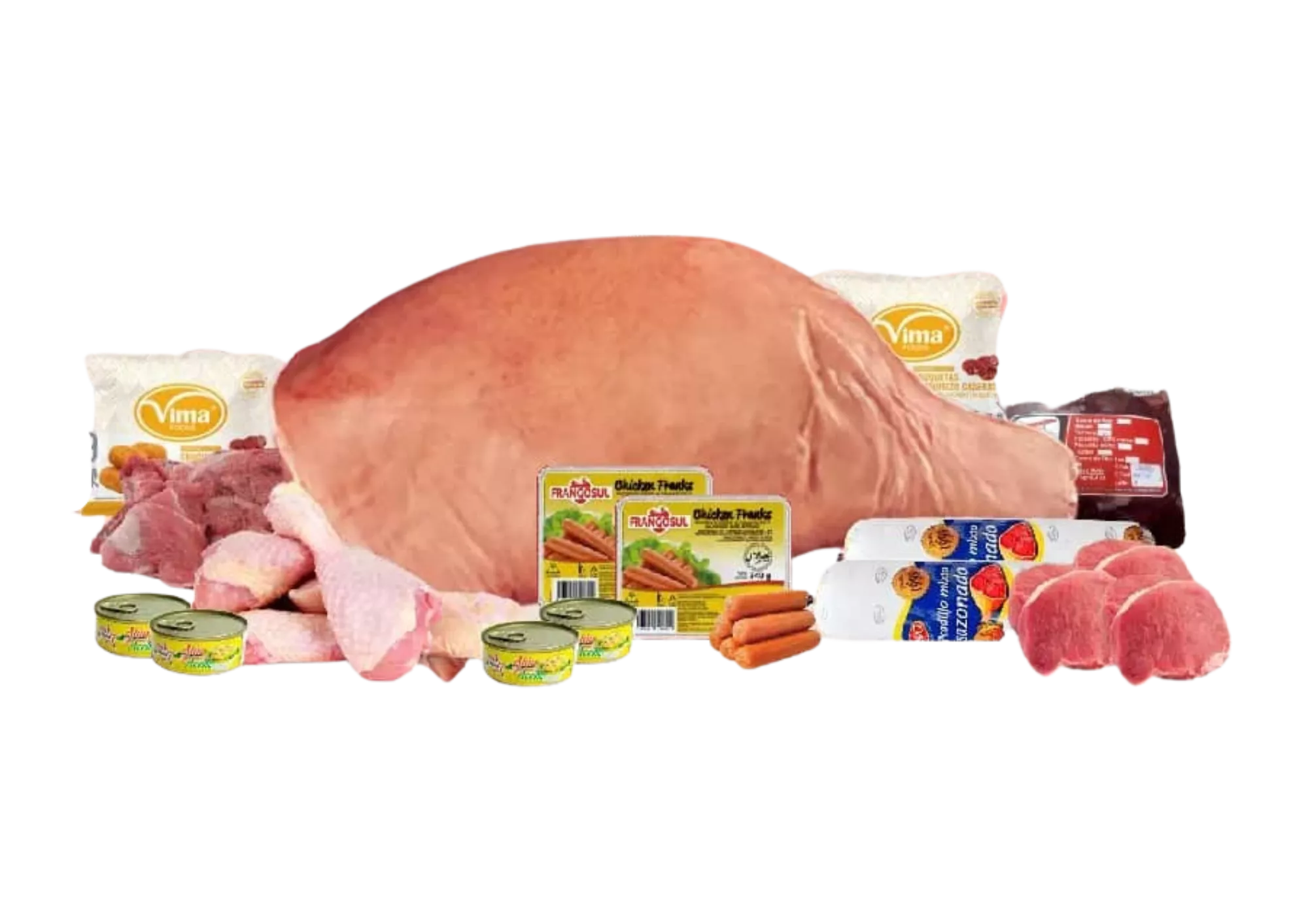 12 Carne de cerdo al corte (lb), 1 Carne de Res 1ra Copal (1kg-2.2lb), 3 Bistec de cerdo (lb), 4 Carnero (lb), 10 Pollo (lb), 2 Picadillo Mixto Bravo (400g), 2 Salchicha de Pollo FRANGOSUL (340g), 2 Croquetas Vima sabor chorizo (500g), 4 Atún en aceite (170g)