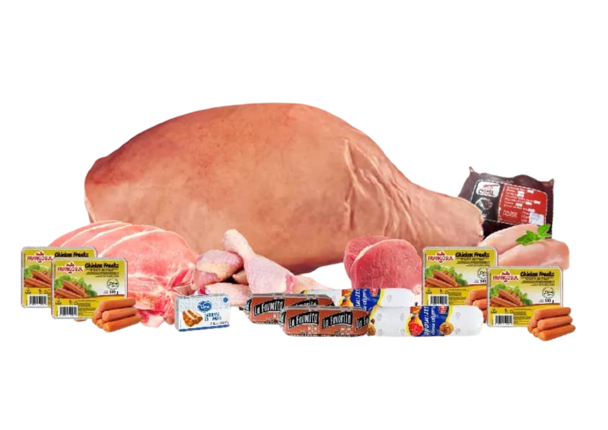 - 10 Carne de cerdo al corte (lb) - 4 Bistec de cerdo (lb) - 4 Chuleta de cerdo (lb) - 5 Carne de cerdo (lb) - 5 Salchicha de Pollo 340g - 4 Picadillo La Favorita (400g) - 5 Picadillo Mixto Sazonado Bravo (400g) - 1 Arroz de 1ra res Copal (1kg-2.2lb) - TE REGALAMOS: 2 Sardina VIMA 113g