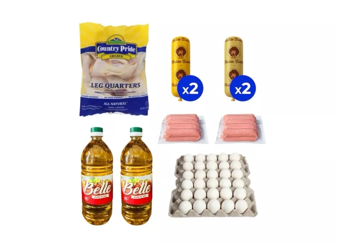 Muslo y contramuslo de pollo (10 lb), 2 picadillo de jamón (500g), 2 picadillo de chorizo (500g), 2 paquete de salchicha de pollo, 2 pomos de aceite 900 ml, Cartón de huevo (30 u)