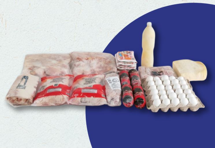 Paquete muslo o contramuslo de pollo 10 lb (x2) Paquete pechuga entera deshuesada 2 kg (x2) Solomillo de cerdo 2.5 lb Lomo de cerdo sin hueso 4 lb Bistec de cerdo 1 kg Cartón de huevos (30 unidades) Picadillo de pollo 400 g (x4) Salchicha de pollo (x5) Queso blanco criollo 4 lb Leche de vaca 1.5 L