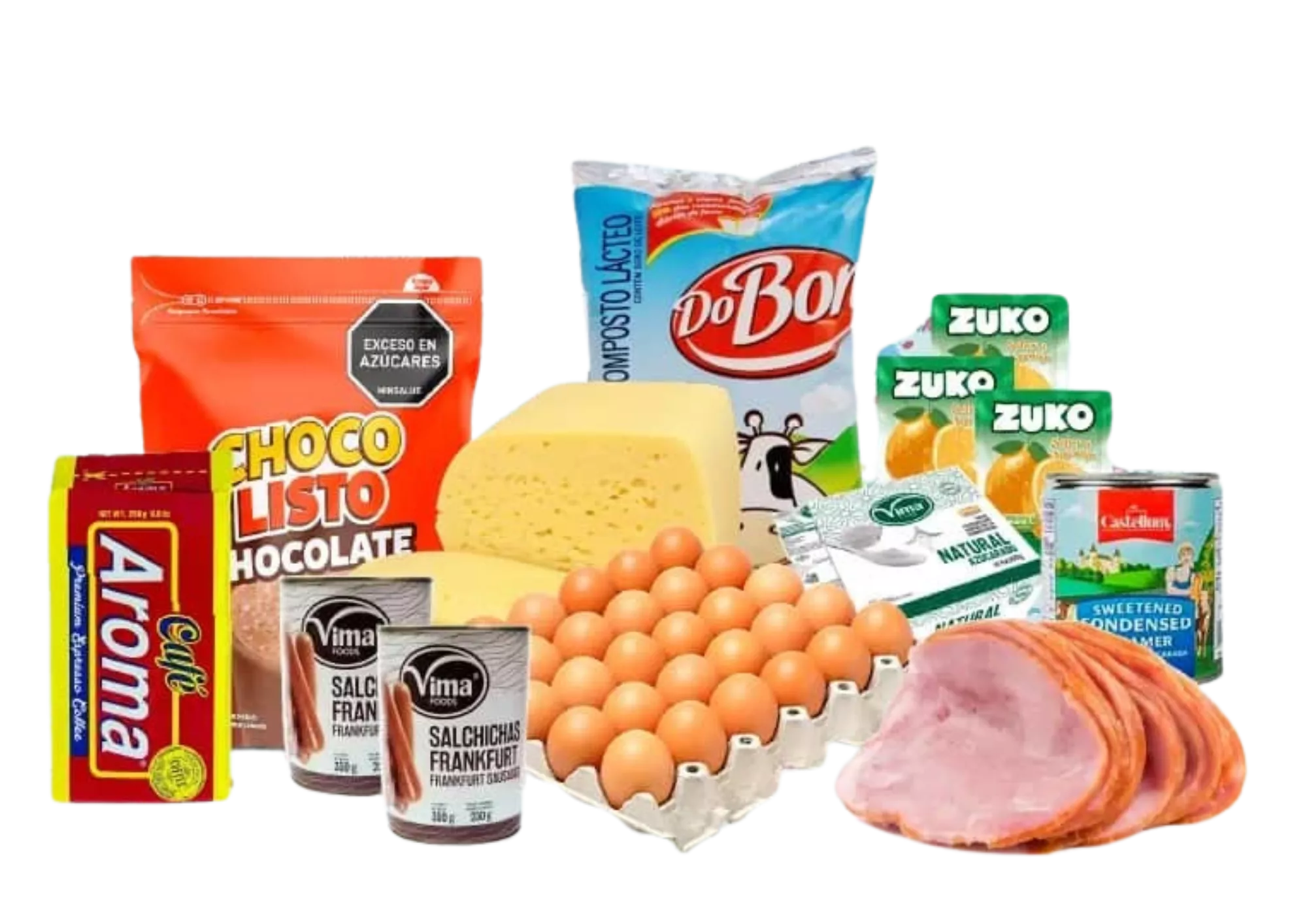 1 Café Aroma (250g), 1 Choco Listo (400g), 2 Salchichas Frankfurt (350g), 1 Cartón de huevos (30u), 2 Queso Criollo (lb), 4 Yogurt Vima (100g), 1 Mantequilla Bella Campo con sal (250g), 1 Preparado de leche entera Dobon (1kg), 1 Leche Condensada Castellum (390g), 2 Jamón Vicky (lb), 3 Refresco en polvo Zuko (Rinde 2Lt)