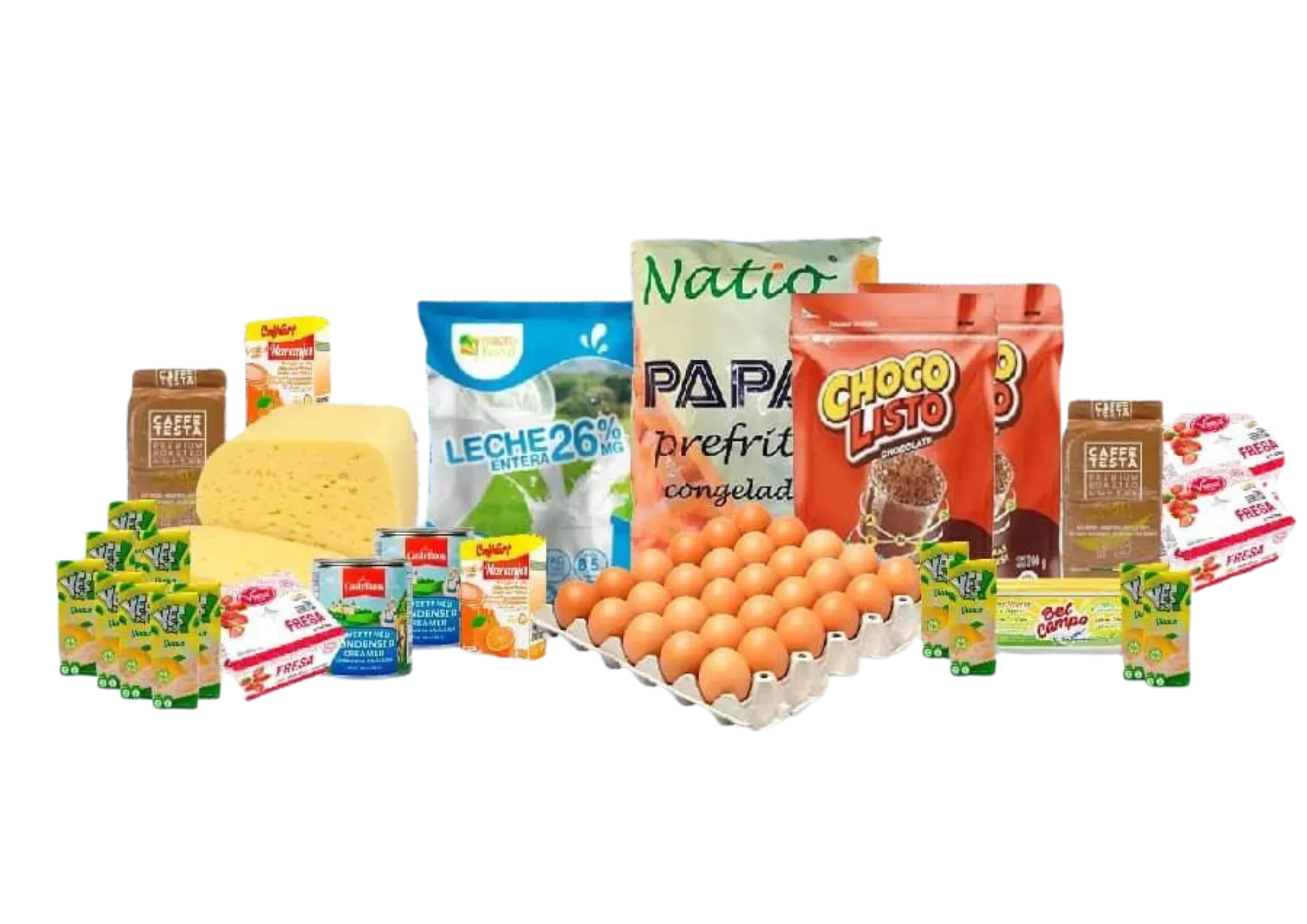 1 Cartón de Huevos (30u), 1 Papas Prefritas Bolsas (2.5kg), 2 Choco Listo (400g), 2 Café Testa Creamy (250g), 2 Leche condensada Castellum (390g), 1 Leche entera (1kg), 4 Queso criollo (lb), 12 Yogurt (120g), 1 Té Verde Carmencita (pqt. 20u), 12 Jugo YES Coctel/mango/uva/guayaba/piña/manzana (200ml), 1 Mantequilla Bella Campo con sal (250g), 2 Gelatina CalNort Plátano/Naranja (170g)