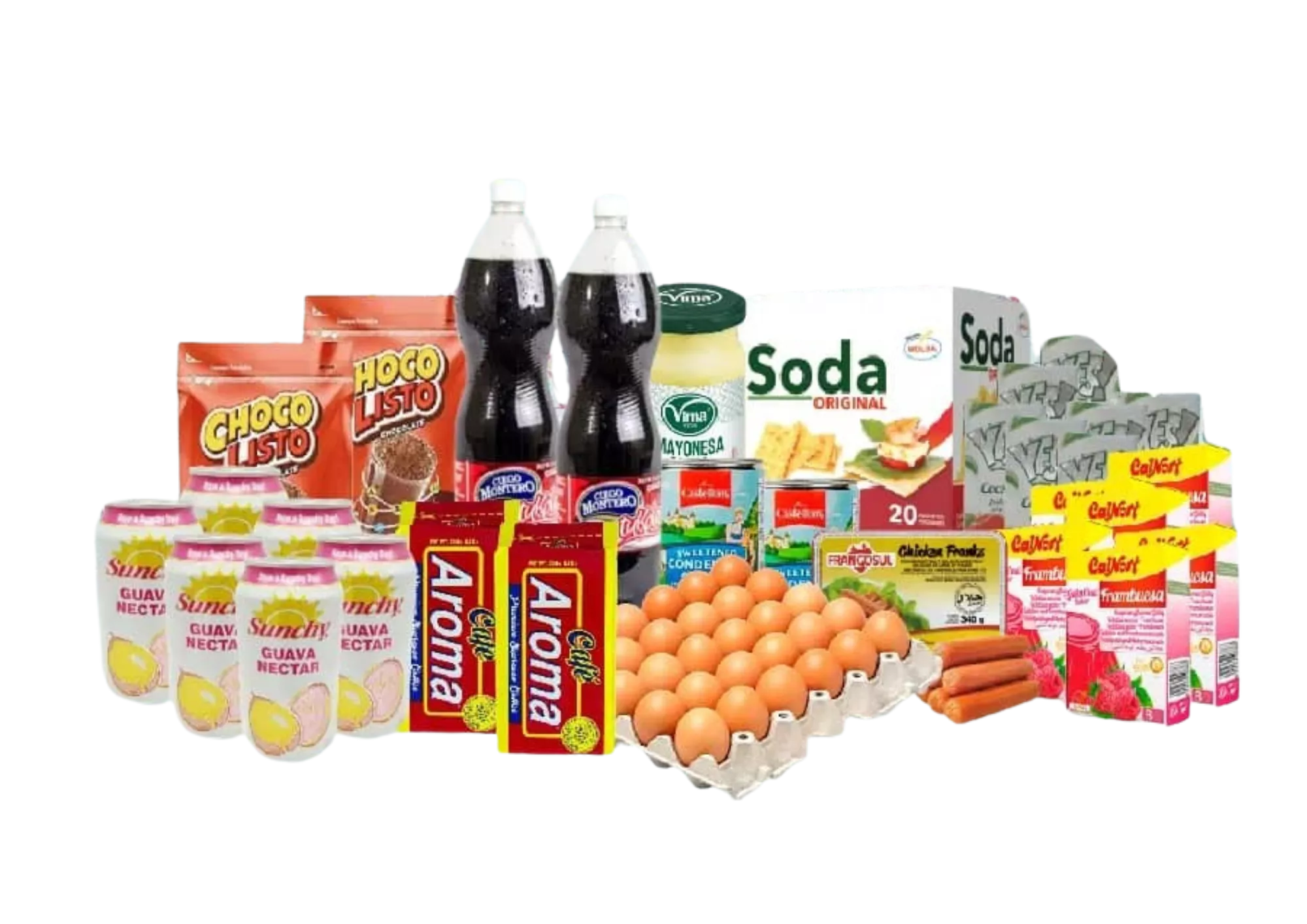 4 Salchichas (10u) 1 Cartón de huevo (30u) 2 Café Aroma (250g) 2 Leche Condensada (390g) 2 Chocolisto de chocolate (400g) 8 Jugo Yes Varios Sabores (200 ml) 2 Refresco Tu Cola Ciego Montero (1500ml) 1 Mayonesa Vima (300ml) 10 Galletas de Soda Original Molsa (30g) 6 Gelatina Calnort Varios Sabores (170g) 8 Jugo Sunchy Varios Sabores (330ml) 2 Refresco limón Ciego Montero (1500ml)