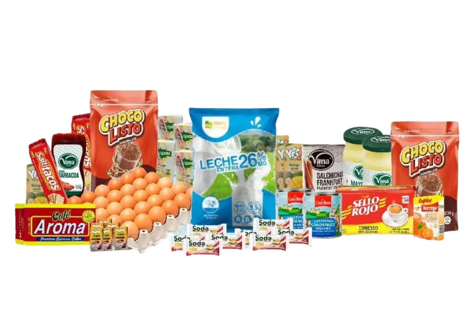 1 Leche Entera (1Kg), 2 Leche Condensada La Granjera (390g), 1 Cartón de huevo (30u), 2 Salchicha de Pollo Frangosul (340g), 2 Choco Listo de Chocolate 400g, 1 Café La Llave (284g), 1 Café Testa (250g), 20 Galletas de soda original Molsa (30g), 2 Galletas Saltitacos, 27 Néctar La Estancia 200 ml, 1 Mayonesa Vima (300ml), 1 Gelatina CalNort (170g), 2 Dulce de Guayaba Val (200g)