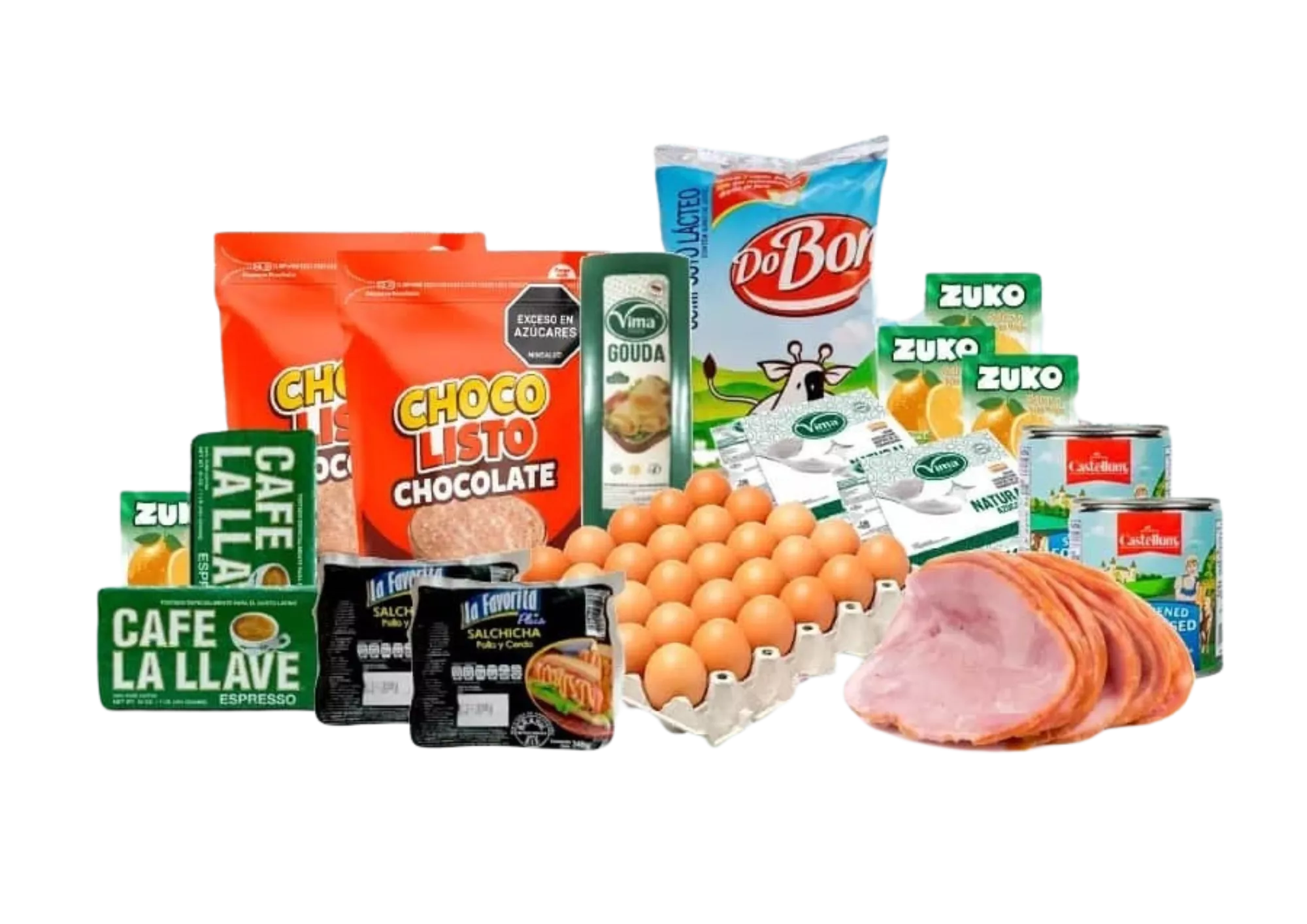 2 Café La Llave (284g), 2 Choco Listo (400g), 2 Salchicha de Pollo y Cerdo La Favorita (340g), 1 Cartón de huevos (30u), 3 Queso gouda (lb), 8 Yogurt Vima (100g), 1 Gelatina CalNort (170g), 1 Preparado de leche entera Dobon (1kg), 2 Leche condensada (390g), 3 Jamón Vicky (lb), 4 Refresco en polvo Zuko (Rinde 2Lt)