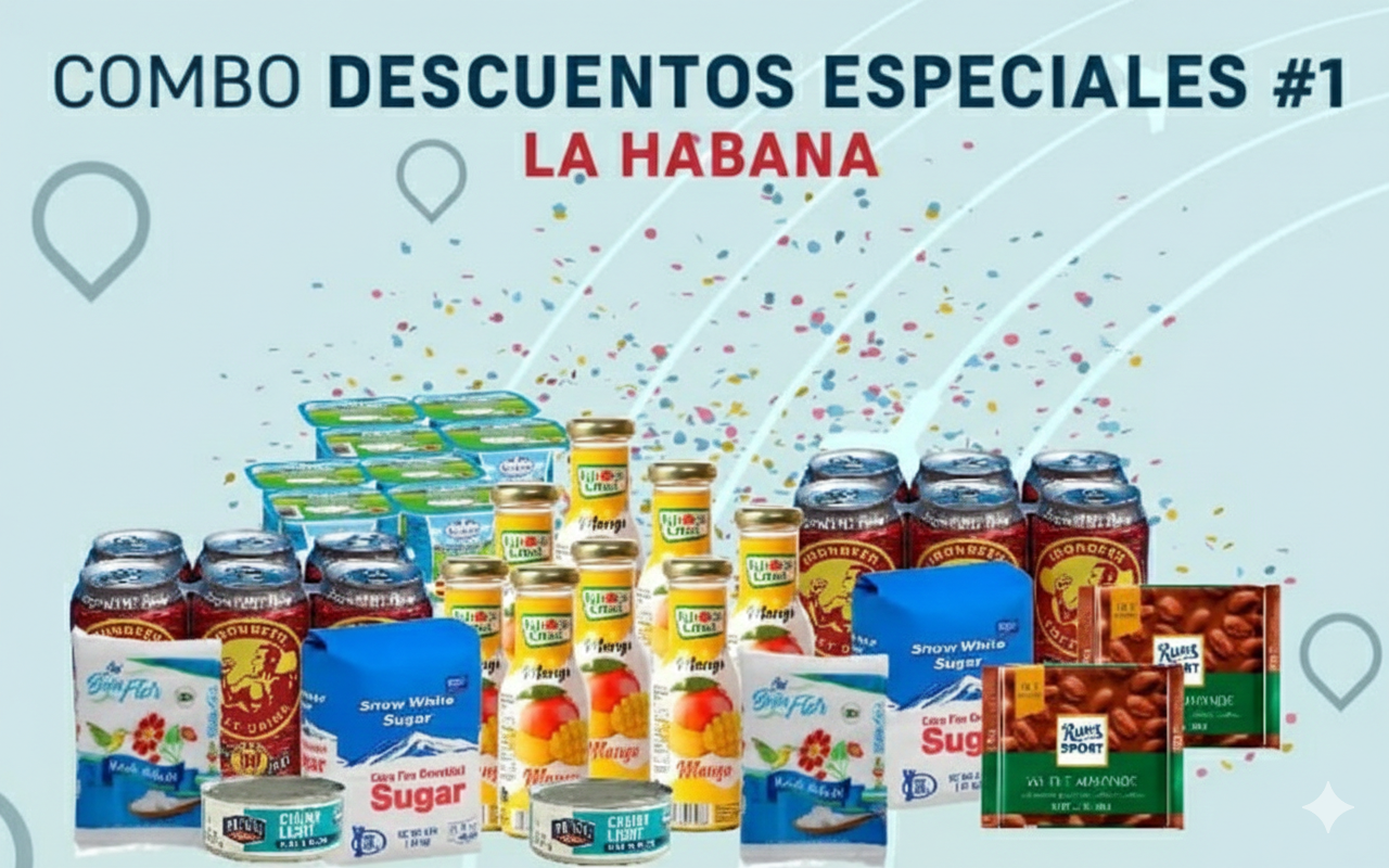 2 Atún Claro en agua Portside (142 g) 2 Tabletas de Chocolate Ritter con Almendras enteras (100 g) 8 Yogurt Asturiana (125 g) 1 Garbanzos con Chorizo Vima (415 g) 8 Jugo Facttorie Crisci (200 ml) 8 Refresco en polvo Zuko 2 Azúcar Blanca extra fina Snow White (1.8 kg / 4 lb) 2 Sal Yodada Bella Flor (1 kg) 12 Refresco Cola Ironbeer Soft Drink (355 ml)