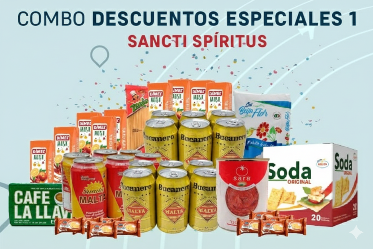 8 Malta Sunchy Lata 355ml 12 Malta Bucanero Lata 355ml 1 Espaguetis Zonia (500g) 1 Pasta de Tomate Sara (800g) 1 Café La Llave (284g) 20 Galletas de Soda Original Molsa (30g) 1 Sal Molida Yodada Bella Flor (1Kg) 8 Galletas Cremelo (22g) 10 Jugo Dimes (200ml)