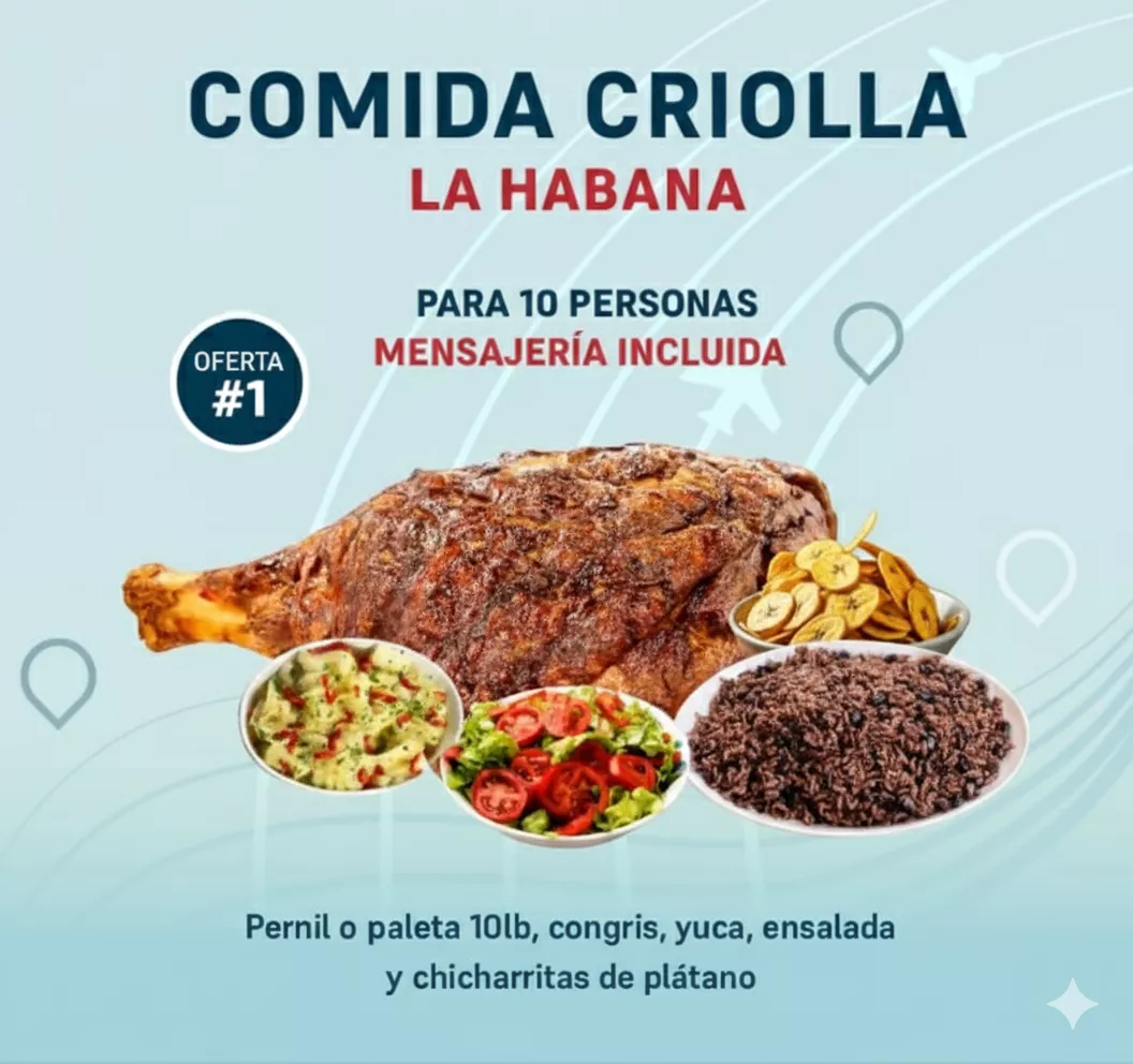 - Pernil o paleta (10 lb) - Congrís (arroz con frijoles negros) - Yuca - Ensalada - Chicharritas de plátano