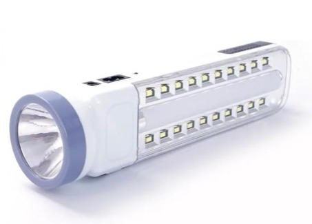 Modelo: GH-666, Fuente de luz LED, Alimentación: Panel solar/CD/110V, Vida útil: 80,000h, Brillo: 100m, Autonomía: 8h, Batería: Polímero litio, Dimensiones: 4x4x10.5 pulgadas, Material: Metal plástico, Color: Blanco