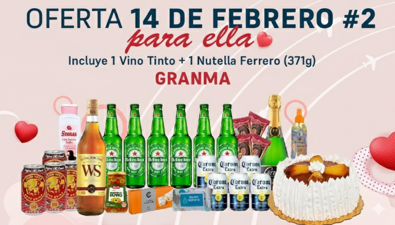 1 Cake redondo 6 Cerveza Heineken (330ml) 6 Cerveza Corona (330ml) 1 Whisky Walther Scott (Lt) 1 Sidra Cereser (660ml) 4 Refresco Cola Ironbeer Soft Drink (355ml) 1 Aceitunas enteras con pimiento Kurtz (163g) 4 Donut Brawo (40g) 1 Dulce de leche Manjar blanco Bonlé (500g) 1 Toallitas húmedas Baby Bain (80u) 1 Crema Hidratante (200ml) 1 Colonia bonabel de Jazmín (300ml) 1 Turrón de Jijona Castillo de Jijona (150g)