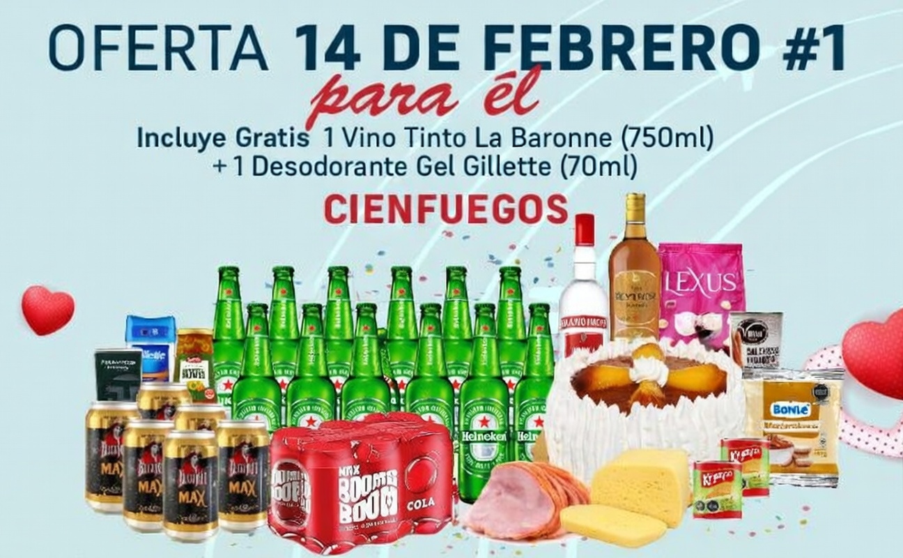 1 Cake Capuccino 12 Cerveza Heineken (330 ml) 6 Cerveza Bucanero Max (330 ml) 1 Vodka Skandinoff (1 L) 1 Ron Reythor Dorado (1 L) 6 Refresco Booms Boom Naranja/Limón/Piña (330 ml) 3 Queso criollo (lb) 2 Jamón Vicking (lb) 1 Aceitunas enteras con pimiento Kurtz (163 g) 1 Bombones LEXUS (1 Kg) 2 Papas Kryzpo sabor crema de cebolla (37 g) 1 Dulce de leche Manjar blanco Bonlé (500 g) 1 Salchichas Frankfurt (350 g) 1 Perfume Dubai essences FOR MEN (100 ml)