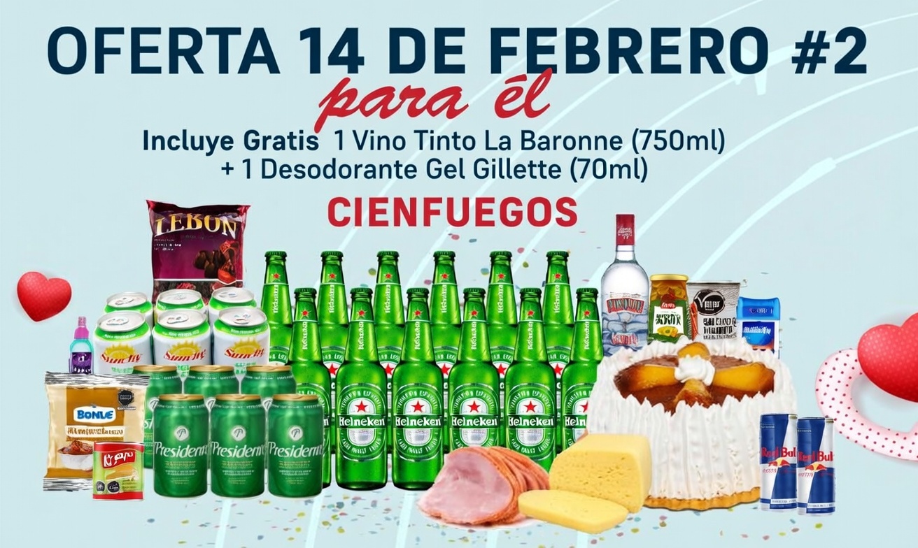 1 Cake Capuccino 12 Cerveza Heineken (330 ml) 6 Cerveza Presidente (330 ml) 1 Vodka Popokelvis (900 ml) 2 RED BULL 6 Jugo Enlatado Sunchy Banana (330 ml) 2 Queso criollo (lb) 2 Jamón Vicking (lb) 1 Aceitunas enteras con pimiento Kurtz (163 g) 1 Bombones LEBOM rellenos con ron (260 g) 1 Papas Kryzpo sabor crema de cebolla (37 g) 1 Dulce de leche Manjar blanco Bonlé (500 g) 1 Salchichas Frankfurt (350 g) 1 Colonia Bonabel AQUA (300 ml)