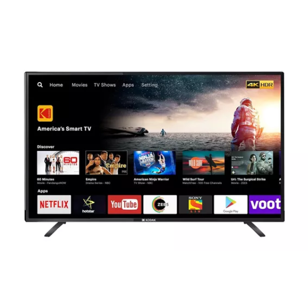 Marca : Kodak Pulgadas: 55" Tipo de pantalla: LED 4K UHD Resolución: 3840 x 2160 p Aplicaciones preinstaladas: Netflix, YouTube, Amazon Prime. Entradas USB: 2 Entradas componente : 1x YPbPr Entradas Ethernet (LAN): 1 Entradas antena: 2 (1 x cable + 1 x aire) Entradas HDMI: 1xARC + 2 (3 en total) Versión HDMI: 2.0 Entradas Audio L-R: 1 Conexión a Internet: Sí Wi-Fi: Sí Dimensiones: 72.2 Cm Alto, 124.5 Cm Ancho, 8.5 Cm Grosor. Peso: 12.91 Kg