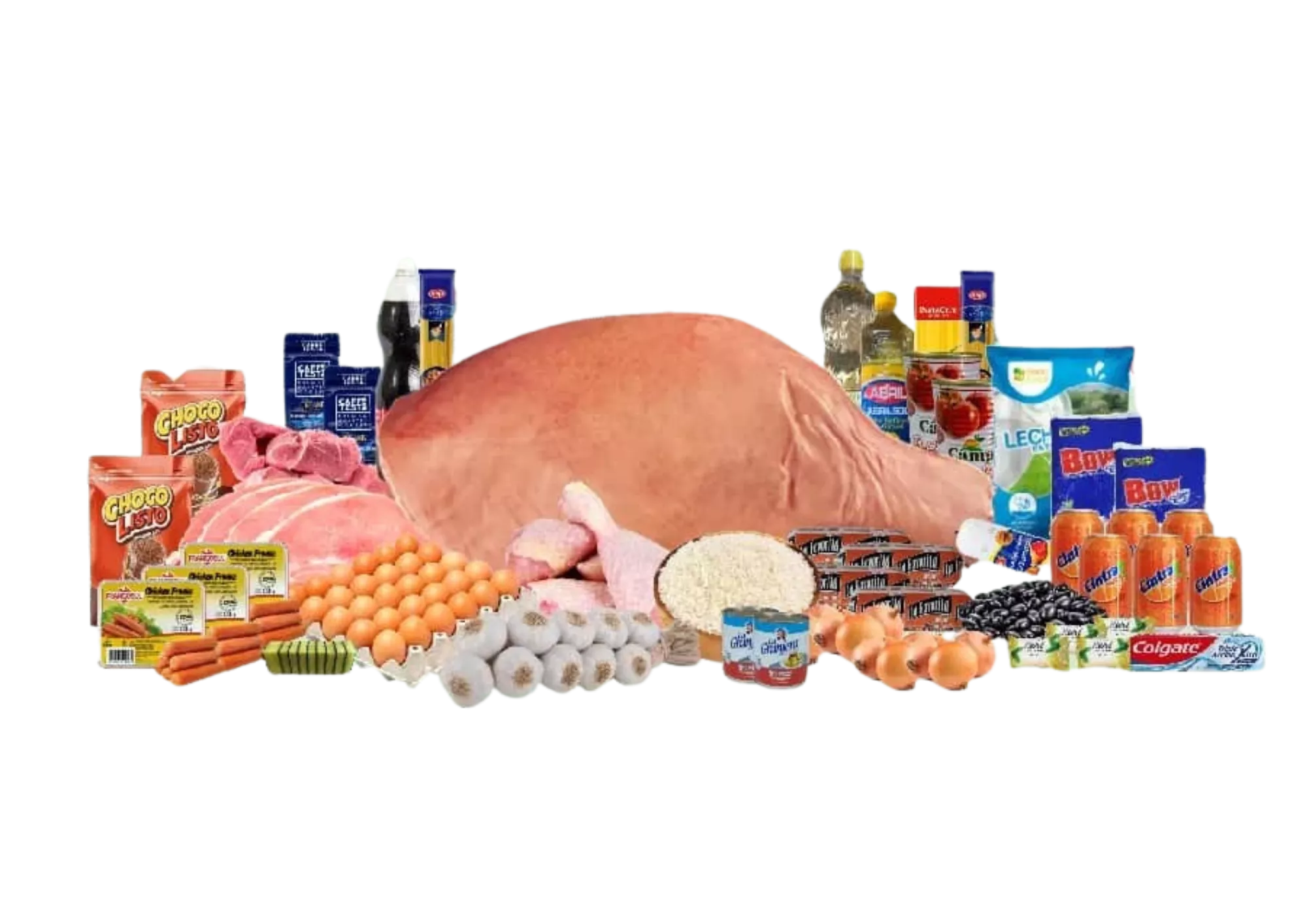 18 Carne de Cerdo al corte (lb), 4 Chuleta de Cerdo (Lbs), 3 Masas de cerdo (lb), 10 Pollo (lb), 4 Picadillo mixto La Favorita (400g), 3 Salchicha de Pollo Frangosul (340g), 12 Cabezas de Ajo, 10 Cebolla morada, 10 Arroz importado Lbs, 8 Frijol Negro (lb), 1 Espaguetis Pasta City 500g, 2 Espaguetis makarna (500 g), 2 Pasta de tomate, Campo Torres (400g), 1 Cartón de huevo (30u), 1 Aceite Abril 1L., 1 Aceite de girasol refinado ALOY (1Lt), 2 Café Testa (250g), 1 Leche Entera (1Kg), 2 Leche Condensada La Granjera (390g), 2 Choco Listo de Chocolate 400g, 4 Jabon de baño Ridel 100 g, 2 Detergete BOW (500g), 1 Papel Sanitario La Excelencia (Pqt 4u), 1 Pasta Colgate Dental (70g), 1 Esponja de fregar YAQI (10u), 6 Refresco Cintra (330 ml)