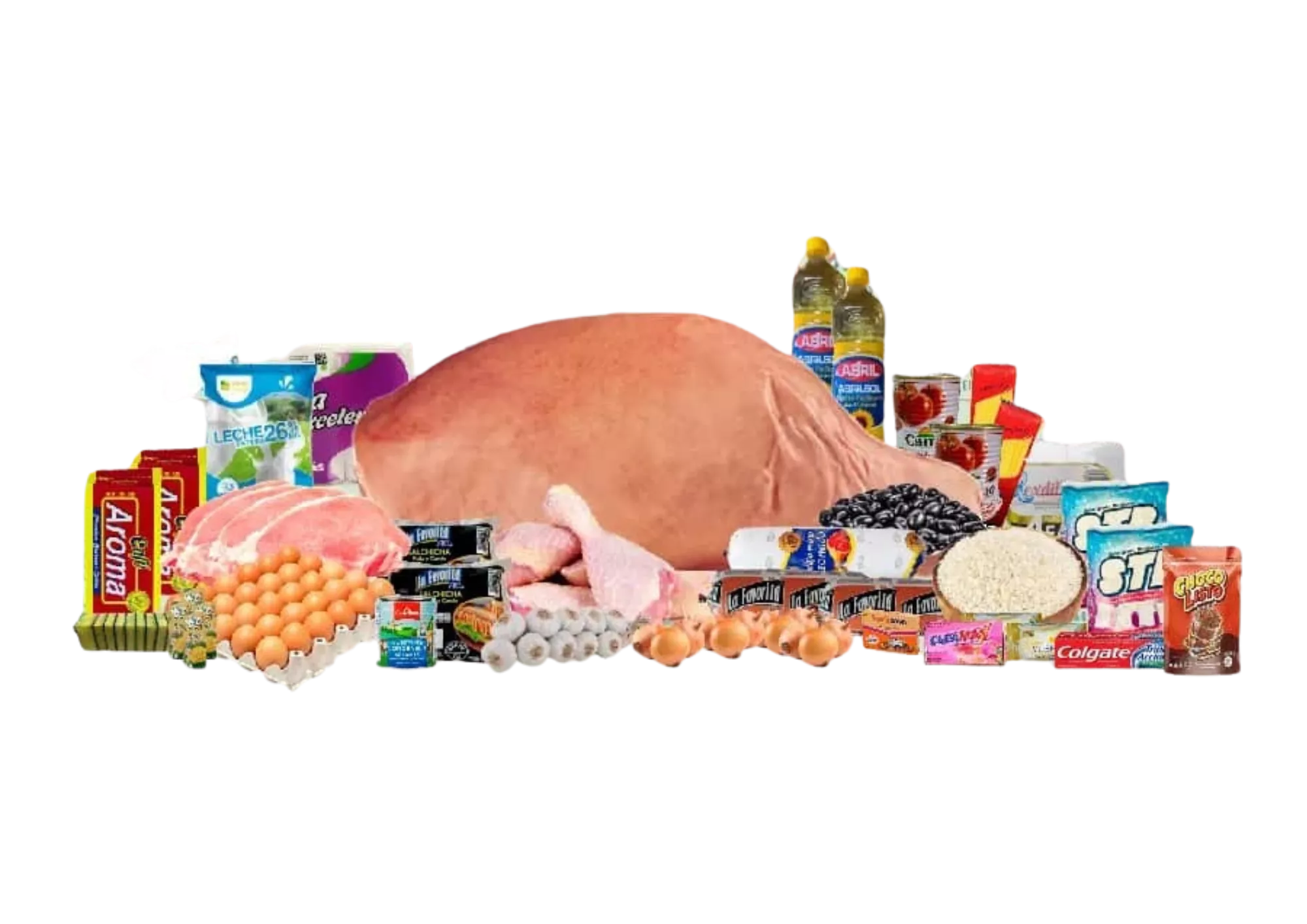 18 Carne de cerdo al corte (lb), 4 Chuleta (lb), 2 Bistec de cerdo (lb), 10 Pollo (lb), 4 Salchicha La Favorita de Pollo y Cerdo (10u/340g), 2 Picadillo condimentado con Aceitunas Bravo (400g), 2 Picadillo La Favorita (400g), 10 Arroz importado (lb), 8 Frijol negro (lb), 1 Cartón de huevos (30u), 2 Espaguetis Porto Bello (500g), 1 Pasta Fusilli DIVELLA (500g), 2 Aceite Abril (1L), 1 Leche entera (1kg), 2 Leche condensada Castellum (390ml), 2 Café Testa Dark (250g), 25 Ajo (cabeza), 1 Cebolla (20 unidades), 6 Jugo Sunchy sabor Guayaba (335ml), 5 Caldo de pollo (u), 2 Jabón de baño (70-125g), 2 Detergente STB Rosa (500g), 1 Esponja de fregar YAQI (10u), 2 Papel sanitario Rexdill (Pqt 4u), 2 Pasta de Tomate Campo Torres (400g), 10 Sazón Goya (u), 1 Pasta Dental Colgate (170g), 1 Chocolisto Chocolate (400g), 1 Jabón de lavar CleaMax (250g)