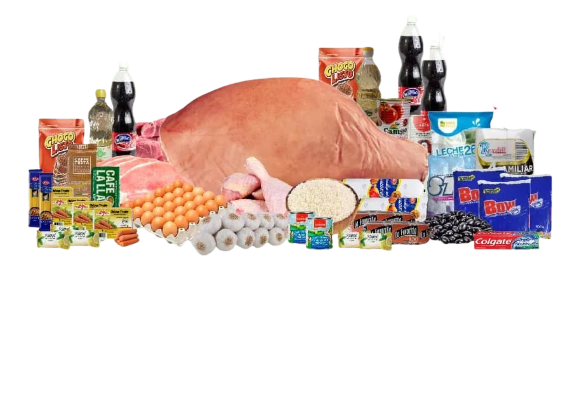 - 18 Carne de cerdo al corte (1kg) - 3 Bistec de cerdo (1kg) - 4 Chuleta de cerdo (1kg) - 10 Pollo (lb) - 4 Sopa (instantánea) - 1 Pasta de Tomate Campo Claro (200g) - 1 Pasta de Tomate Conchita (200g) - 2 Leche condensada La Granjera (390g) - 2 Chocolate en barra - 1 Maicitos de 1kg - 2 Café Tasa (125g) - 1 Picadillo Mixto Sazonado Bravo (Pqt) - 1 Refresco en polvo (300g) - 6 Galletas de huevos (300g) - 6 Galletas de mantequilla (300g) - 6 Galletas de limón (300g) - 6 Galletas de chocolate (300g) - 6 Galletas de naranja (300g) - 1 Aceite refinado de girasol Aloy (1L) - 1 Aceite de soya (1L) - 1 Pasta Dental Colgate (70g) - 1 Detergente STB 1kg - 1 Papel Sanitario (4 rollos) - 1 Jabón PALMOLIVE (150g) - TE REGALAMOS: 2 estuche de Gelatina Clamore (150ml)
