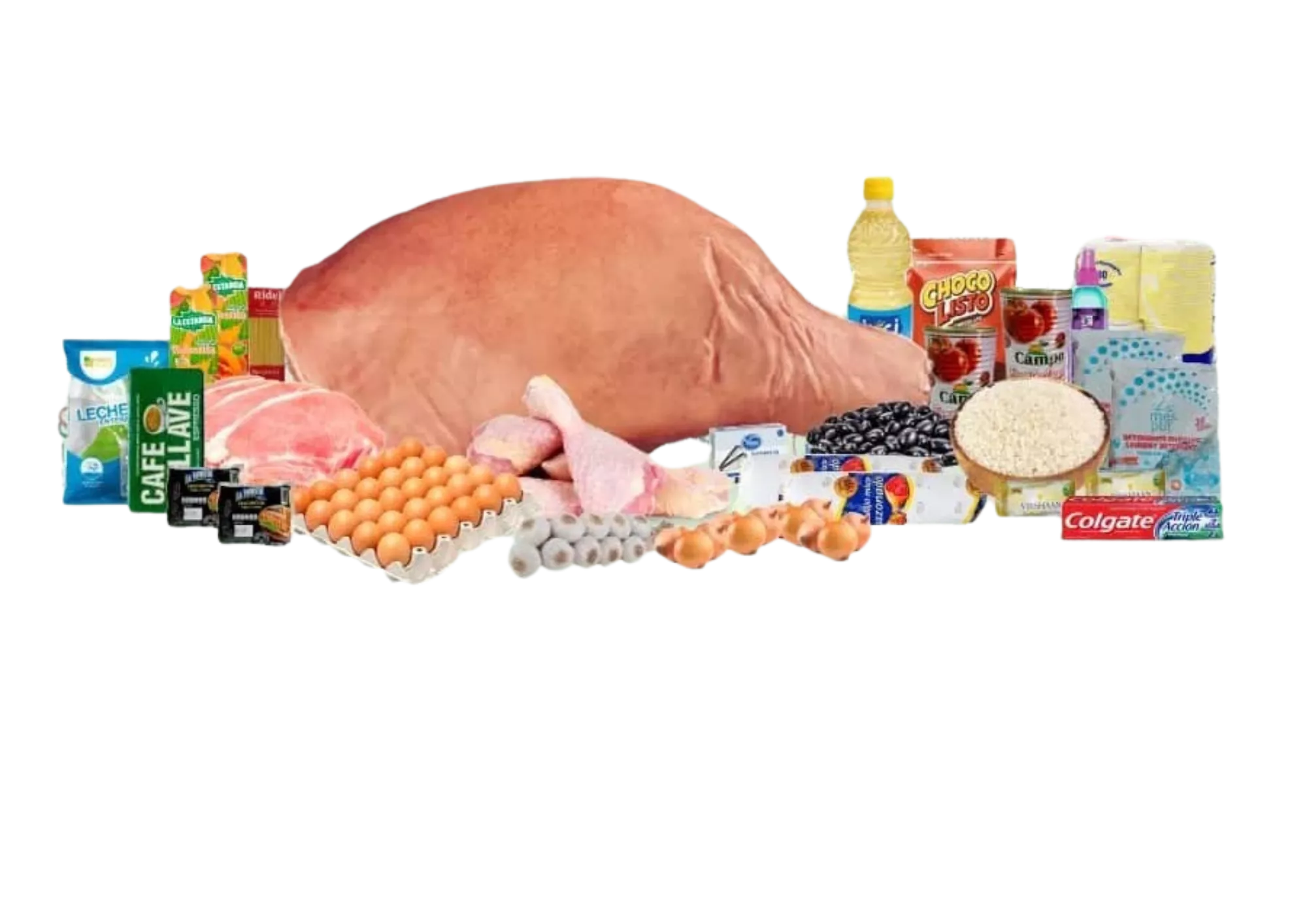 1 Carne Pernil o Paleta (18 lb), 5 Chuletas (lb), 6 Pollo (lb), 2 Picadillo Mixto condimentado (400g), 2 Salchicha La Favorita (340g), 1 Cartón de Huevos (30u), 1 Aceite Girasol (1L), 1 Café La Llave Espresso (284g), 2 Pasta de tomate Campo Torres (400g), 1 Spaguettis (500g), 2 Néctar La Estancia (1L), 1 Sardinas en Aceite (113g), 1 Leche en polvo Entera (1kg), 5 Arroz de importación (lb), 3 Frijoles Negros/Colorados (lb), 1 Cabezas de Ajo (25u), 1 Cebollas (20u), 2 Jabón de baño (90-125g), 1 Pasta de dientes Colgate (70g), 1 Papel Higiénico (paq x 4 rollos), 1 Colonia Bonabel (300ml), 2 Detergente en polvo (500g), 1 Chocolisto de chocolate (400g), 1 Esponja de fregar YAQI (5u)
