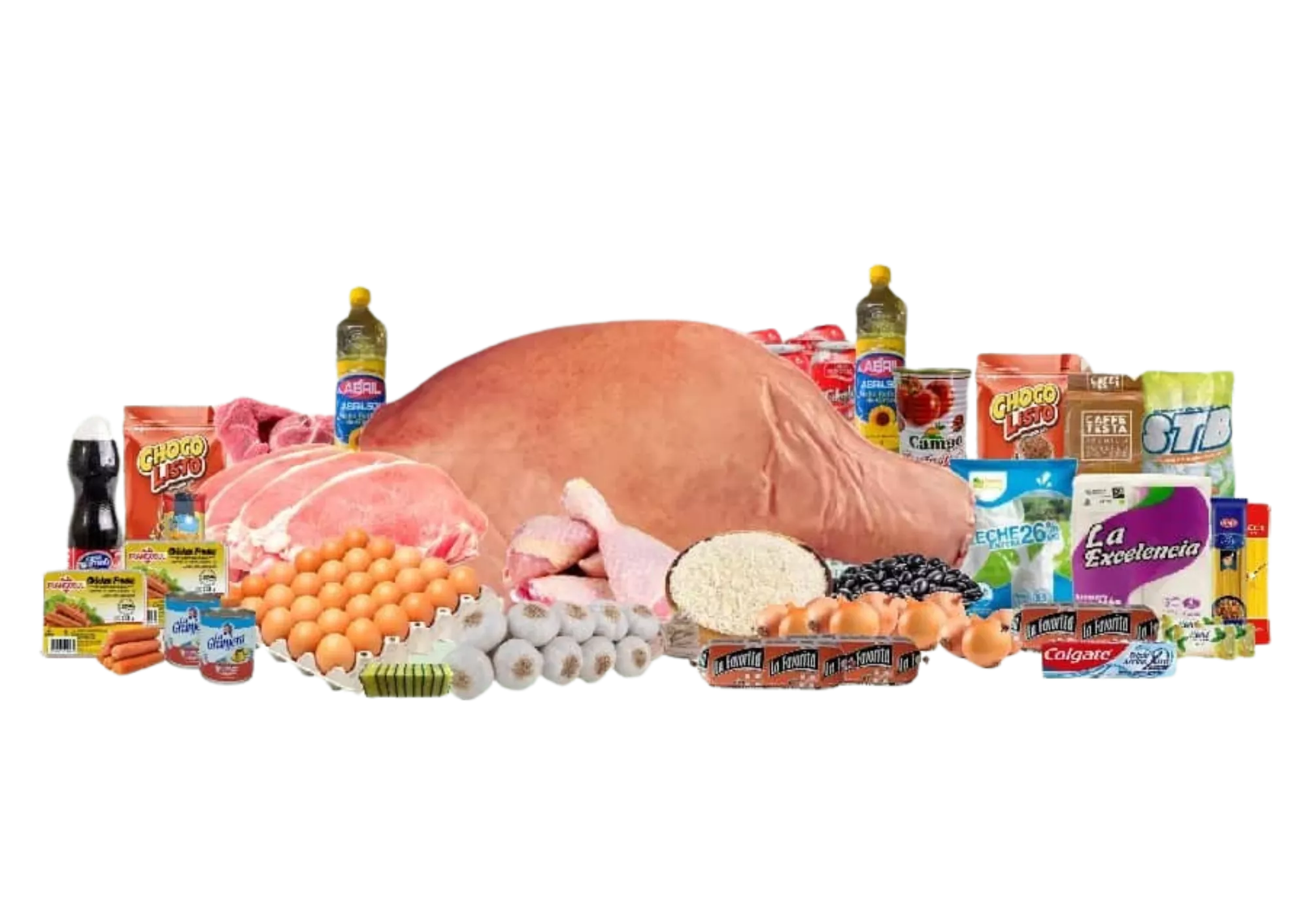 15 Carne de Cerdo al corte (lb), 3 Chuleta de Cerdo (Lbs), 2 Bistec de cerdo (lb), 8 Pollo (lb), 3 Picadillo mixto La Favorita (400g), 2 Salchicha de Pollo Frangosul (340g), 12 Cabezas de Ajo, 10 Cebolla morada, 8 Arroz importado Lbs, 6 Frijol Negro (lb), 1 Espaguetis Pasta City 500g, 1 Espaguetis makarna (500 g), 1 Pasta de tomate, Campo Torres (400g), 1 Leche Entera (1Kg), 2 Leche Condensada La Granjera (390g), 2 Choco Listo de Chocolate 400g, 1 Cartón de huevo (30u), 1 Café Testa (250g), 2 Aceite Abril (1L), 3 Jabon de baño Ridel 100 g, 1 Papel Sanitario La Excelencia (Pqt 4u), 1 Detergente STB Limón (1Kg), 1 Pasta Colgate Dental (70g), 1 Esponja de fregar YAQI (10u), 5 Refresco Ciego Montero (355ml)