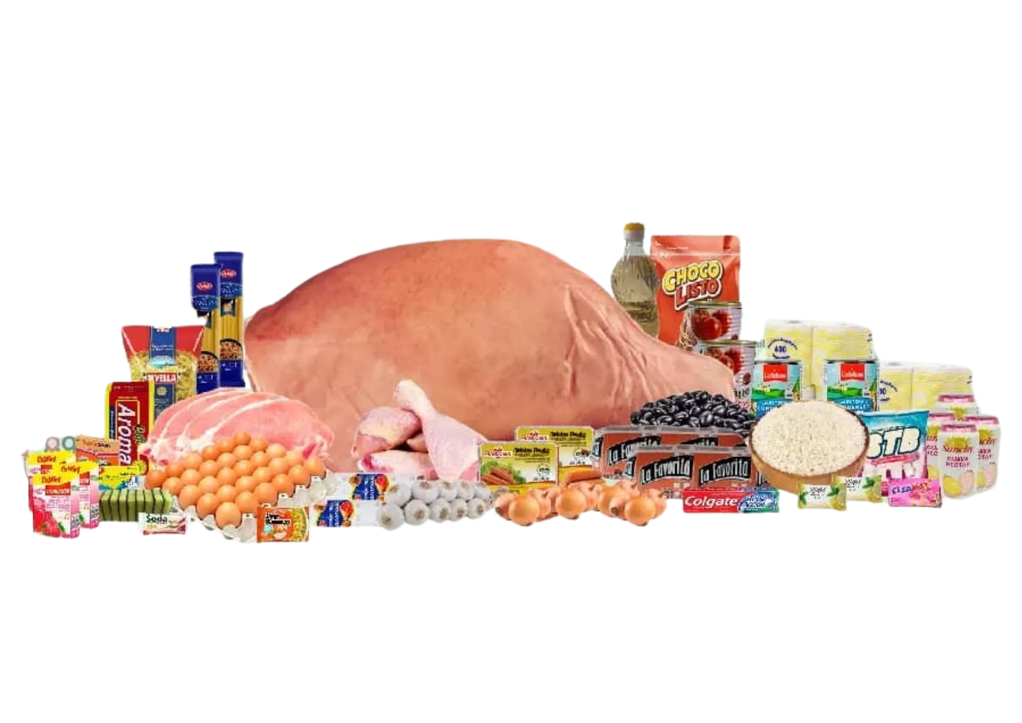 16 Carne de Cerdo (Lb) 2 Chuleta (Lb) 6 Pollo (Lb) 2 Bistec de res, COPAL SURL (1.00kg - 2.2lb) 1 Sardina en tomate (113g) 1 Salchichas (10u) 1 Sardina en aceite Vima (113g) 1 Cartón de huevo (30u) 1 Aceite refinado de girasol Vima (1L) 7 Arroz importado (Lb) 5 Frijol negro (Lb) 2 Pasta de tomate Campo Torres (400g) 2 Espaguetis Makarna (500g) 1 Pasta Fusilli DIVELLA (500g) 1 Café Aroma (250g) 2 Leche Condensada (390g) 1 Chocolisto de chocolate (400g) 20 Ajo (u) 15 Cebolla (u) 10 Sazón Goya (u) 1 Caldo sabor a pollo Maggi (6u) 2 Jabón de baño Ridel (100g) 1 Jabón de lavar CleaMax (250g) 1 Detergente STB Rosa (1kg) 2 Papel sanitario (Pqt. 4u) 1 Pasta dental Colgate Triple Acción (70ml) 1 Esponja de fregar YAQI (10u) 4 Jugo Sunchy Varios Sabores (330ml)