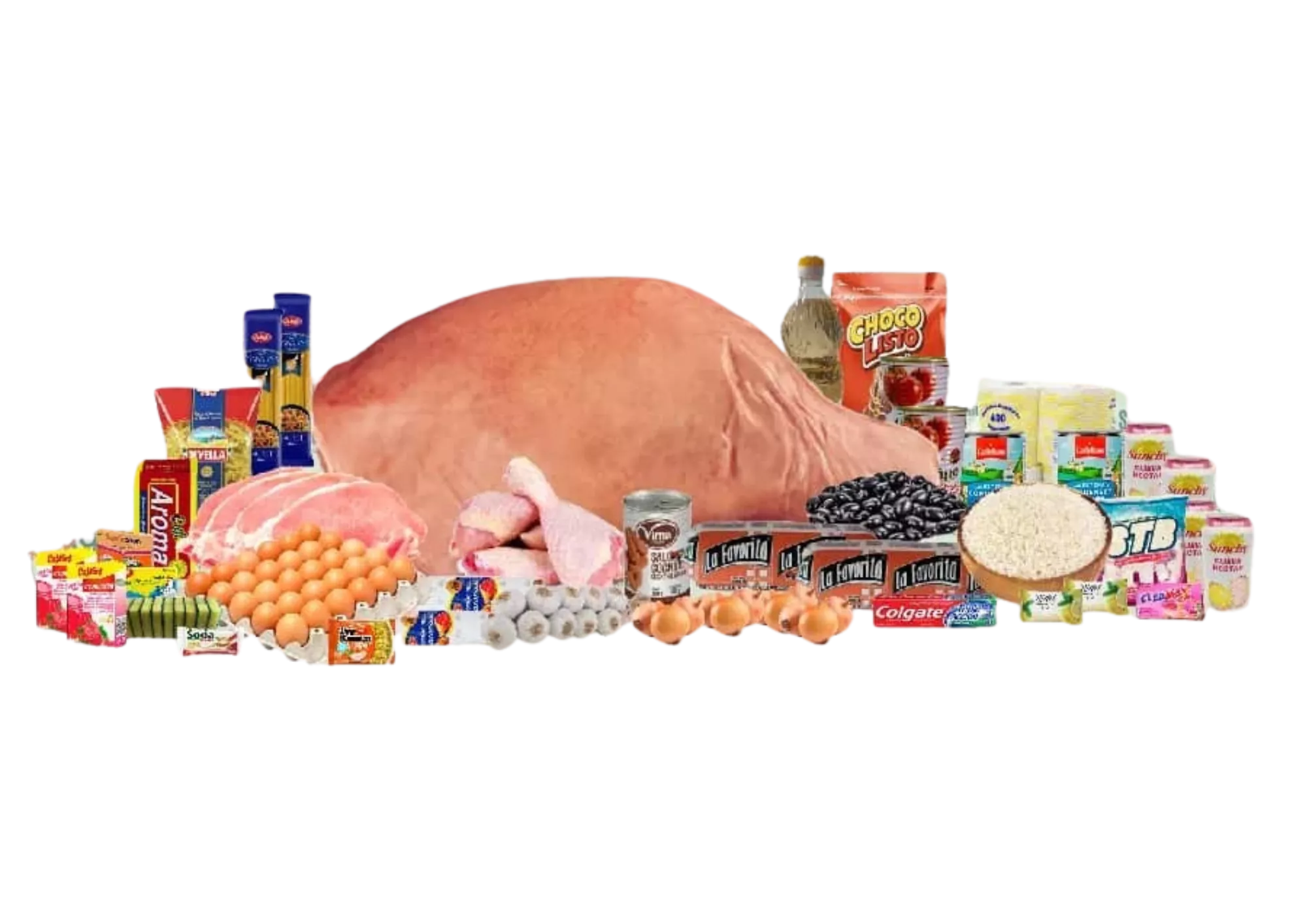14 Carne de Cerdo (Lb) 6 Pollo (Lb) 2 Chuleta (Lb) 1 Sardina en aceite Vima (113g) 1 Cartón de huevo (30u) 1 Aceite refinado de girasol Vima (1L) 6 Arroz importado (Lb) 4 Frijol negro (Lb) 2 Pasta de tomate Campo Torres (400g) 2 Espaguetis Makarna (500g) 1 Pasta Fusilli DIVELLA (500g) 1 Café Aroma (250g) 2 Leche Condensada (390g) 1 Chocolisto de chocolate (400g) 15 Ajo (u) 10 Cebolla (u) 5 Sazón Goya (u) 1 Caldo sabor a pollo Maggi (6u) 2 Jabón de baño Ridel (100g) 1 Jabón de lavar CleaMax (250g) 1 Detergente STB Rosa (1kg) 1 Papel sanitario (Pqt. 4u) 1 Pasta dental Colgate Triple Acción (70ml) 1 Esponja de fregar YAQI (10u) 4 Jugo Sunchy Varios Sabores (330ml) 2 Gelatina Calnort Varios Sabores (170g)