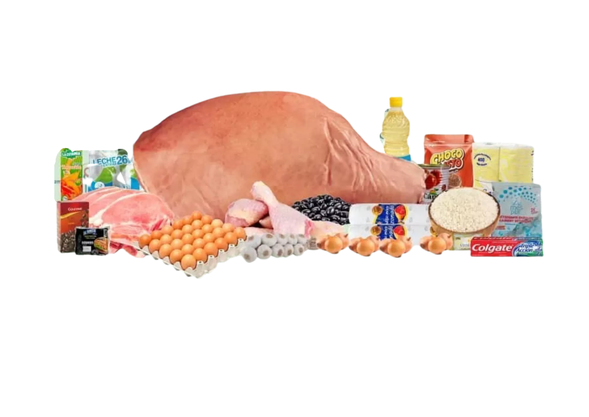 1 Carne Pernil o Paleta (15 lb), 4 Chuletas (lb), 5 Pollo (lb), 1 Picadillo Mixto condimentado (400g), 1 Salchicha La Favorita (340g), 1 Cartón de Huevos (30u), 1 Aceite Girasol (1L), 2 Coditos (500g), 1 Café Molido (250g), 2 Malta Sunchy botella (207ml), 1 Leche en polvo Entera (1kg), 1 Pasta de tomate Campo Torres (400g), 5 Arroz de importación (lb), 3 Frijoles Negros/Colorados (lb), 12 Cabezas de Ajo (u), 12 Cebollas (u), 2 Jabón de baño (90-125g), 1 Pasta de dientes Colgate (70g), 1 Papel Higiénico (paq x 4 rollos), 1 Detergente en polvo (500g), 1 Chocolisto de chocolate (400g), 1 Esponja de fregar YAQI (5u)