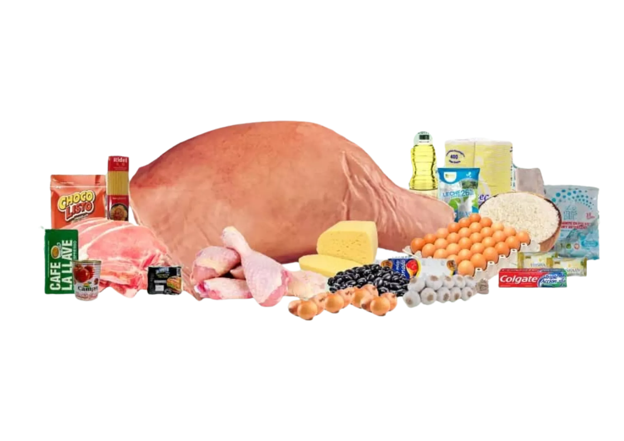 12 Carne de cerdo al corte (lb), 4 Chuleta (lb), 5 Pollo (lb), 1 Salchichas La Favorita (340g), 1 Picadillo mixto sazonado (400g), 1 Cartón de huevo (30u), 1 Aceite Girasol INCI (1L), 1 Leche en polvo entera (1kg), 1 Café La Llave (283g), 1 Pasta de tomate Campo Torres (400g), 5 Arroz criollo (lb), 3 Frijoles negros (lb), 15 Ajo (u), 1 Detergente (500g), 2 Jabón de baño (90-120g), 1 Pasta dental Colgate (70ml), 1 Papel Sanitario La Excelencia (Pqt 4u), 1 Chocolisto de chocolate (400g)