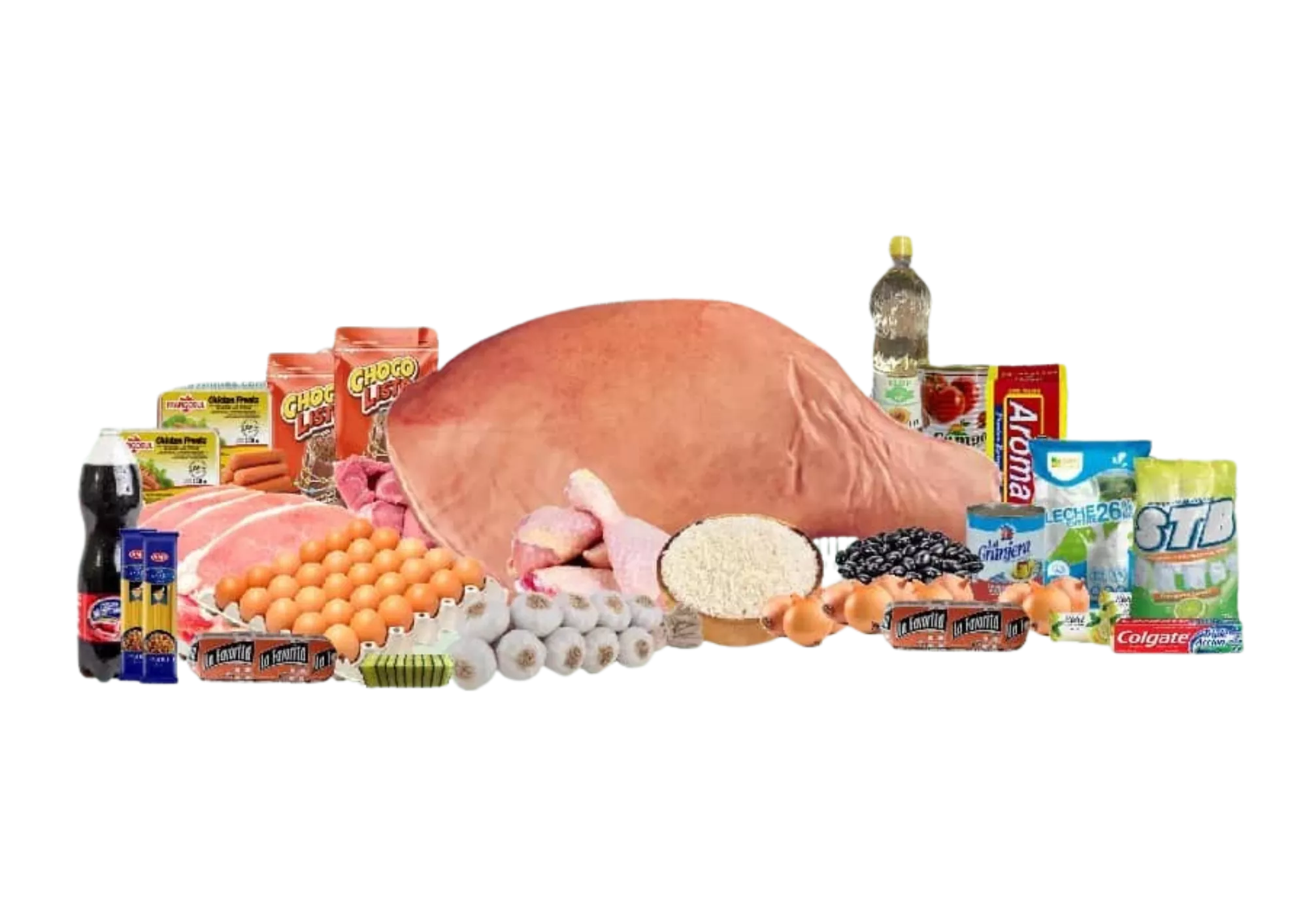 12 Carne de Cerdo al corte (lb), 2 Chuleta de Cerdo (Lbs), 2 Masas de cerdo (lb), 6 Pollo (lb), 2 Picadillo mixto La Favorita (400g), 2 Salchicha de Pollo Frangosul (340g), 8 Cabezas de Ajo, 6 Arroz importado Lbs, 4 Frijol Negro (lb), 2 Espaguetis makarna (500G), 1 Pasta de tomate, Campo Torres (400g), 1 Aceite de girasol refinado ALOY (1Lt), 1 Café Aroma 250g, 1 Cartón de huevo (30u), 2 Refresco Ciego Montero (1500ml), 1 Leche Entera (1Kg), 1 Leche Condensada La Granjera (390g), 2 Choco Listo de Chocolate 400g, 3 Jabon de baño Ridel 100 g, 1 Pasta Colgate Dental (70g), 1 Esponja de fregar YAQI (10u), 1 Detergente STB Limón (1Kg)