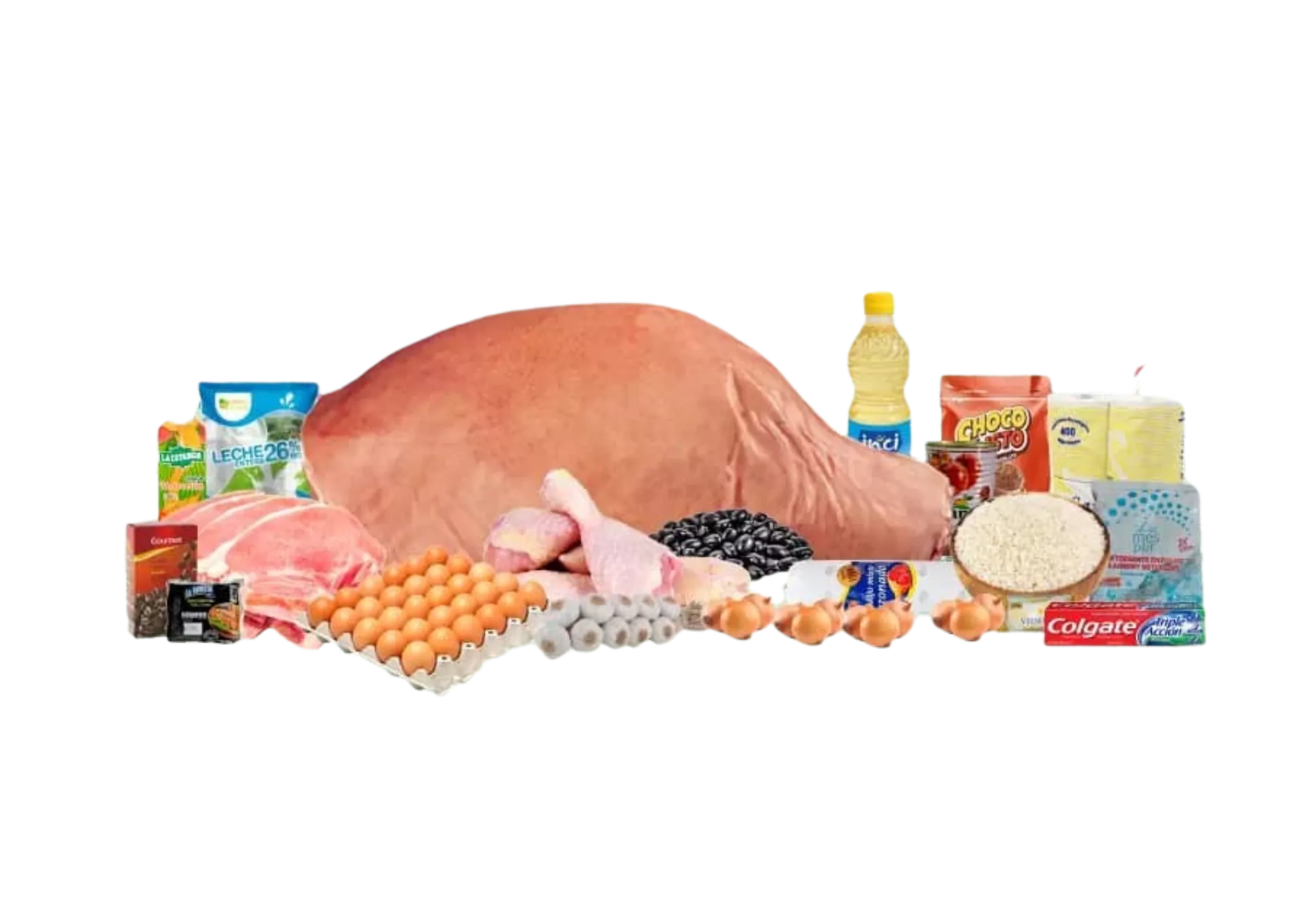 1 Carne Pernil o Paleta (12 lb), 3 Chuletas (lb), 5 Pollo (lb), 1 Picadillo Mixto condimentado (400g), 1 Salchicha La Favorita (340g), 1 Cartón de Huevos (30u), 1 Pasta de tomate Campo Torres (400g), 1 Aceite Girasol (1L), 1 Coditos (500g), 1 Café Molido (250g), 2 Malta Sunchy botella (207ml), 1 Leche en polvo Entera (1kg), 4 Arroz de importación (lb), 2 Frijoles Negros/Colorados (lb), 10 Cabezas de Ajo (u), 2 Jabón de baño (90-125g), 1 Pasta de dientes Colgate (70g), 1 Papel Higiénico (paq x 4 rollos), 1 Detergente en polvo (500g), 1 Chocolisto de chocolate (400g), 1 Esponja de fregar YAQI (5u)