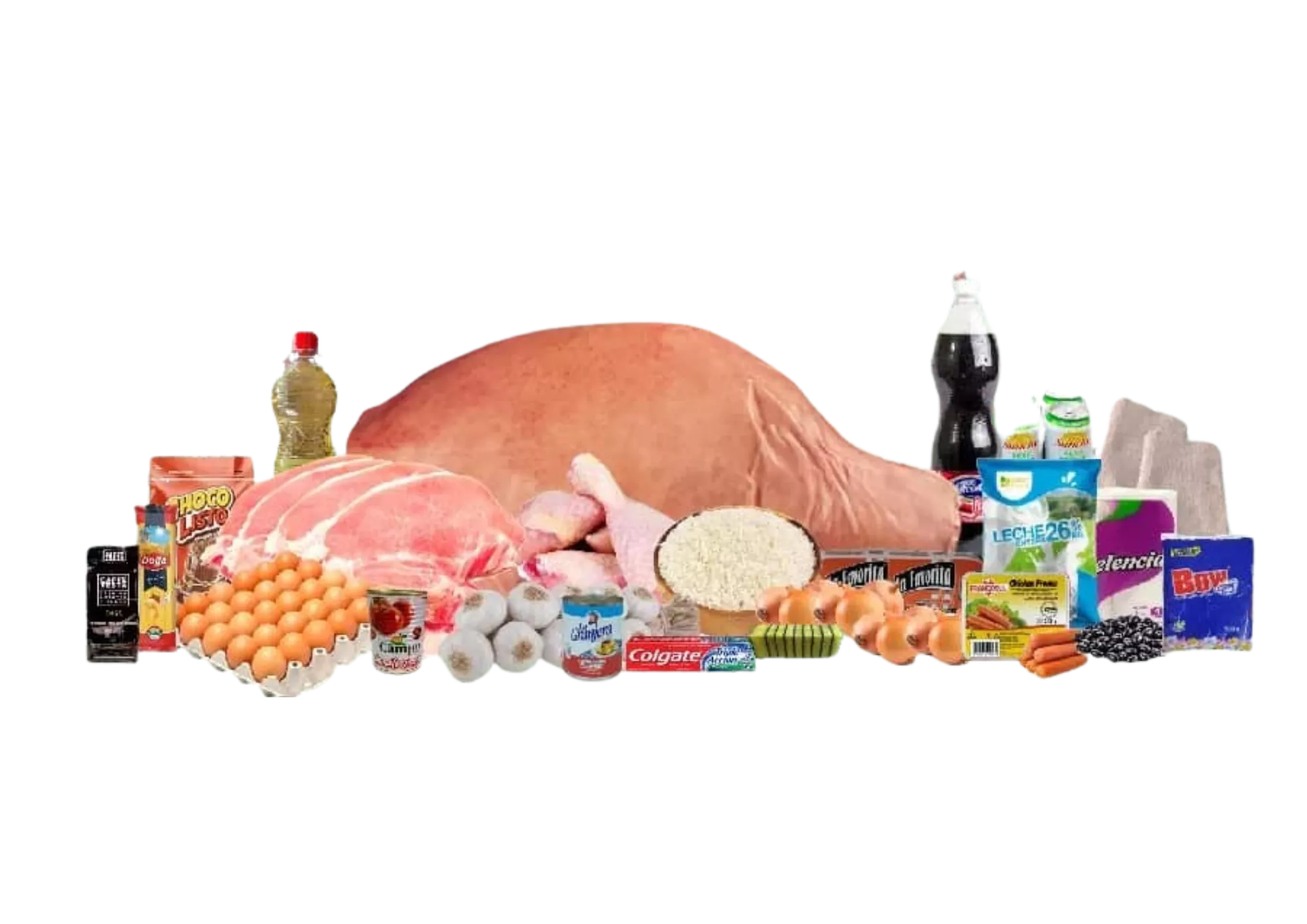 10 Carne de Cerdo al corte (lb), 2 Chuleta de Cerdo (Lbs), 5 Pollo (lb), 2 Picadillo mixto La Favorita (400g), 1 Salchicha de Pollo Frangosul (340g), 5 Cabezas de Ajo, 4 Arroz importado Lbs, 2 Frijol Negro (lb), 1 Espaguetis Doga (Pqt. 500g), 1 Pasta de tomate, Campo Torres (400g), 4 Jugo Sunchy (330ml), 1 Leche Entera (1Kg), 1 Leche Condensada La Granjera (390g), 1 Choco Listo de Chocolate 400g, 1 Aceite Abril 1L., 1 Cartón de huevo (30u), 1 Café Testa (250g), 1 Papel Sanitario La Excelencia (Pqt 4u), 1 Jabones SAFECARE Floral Softness (80g x 3u), 1 Pasta Colgate Dental (70g), 1 Esponja de fregar YAQI (10u), 1 Detergete BOW (500g), 2 Frazada de Piso(u)