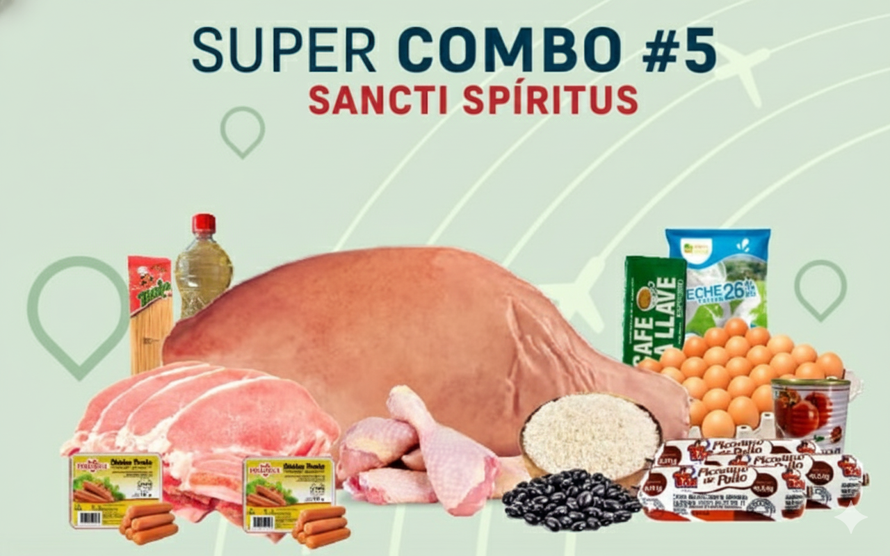 8 Carne de Cerdo al corte (lb) 2 Chuleta de Cerdo (Lbs) 5 Pollo (lb) 3 Picadillo de pollo Guibon (400g) 2 Salchicha de Pollo (340g) 5 Arroz importado (lb) 4 Frijol Negro (lb) 1 Espaguetis Zonia (500g) 1 Pasta de tomate Campo Torres (400g) 1 Aceite de Soya Hysa (1L) 1 Cartón de huevo (30u) 1 Café La Llave (284g) 1 Leche Entera (1Kg)