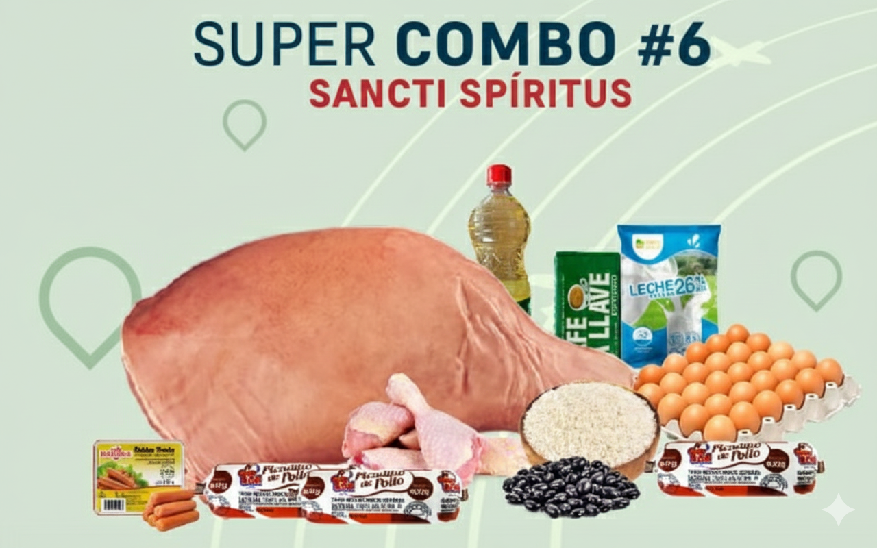 8 Carne de Cerdo al corte (lb) 4 Pollo (lb) 3 Picadillo de pollo Guibon (400g) 2 Salchicha de Pollo (340g) 4 Arroz importado (lb) 3 Frijol Negro (lb) 1 Aceite de Soya Hysa (1L) 1 Cartón de huevo (30u) 1 Café La Llave (284g) 1 Leche Entera (1Kg)