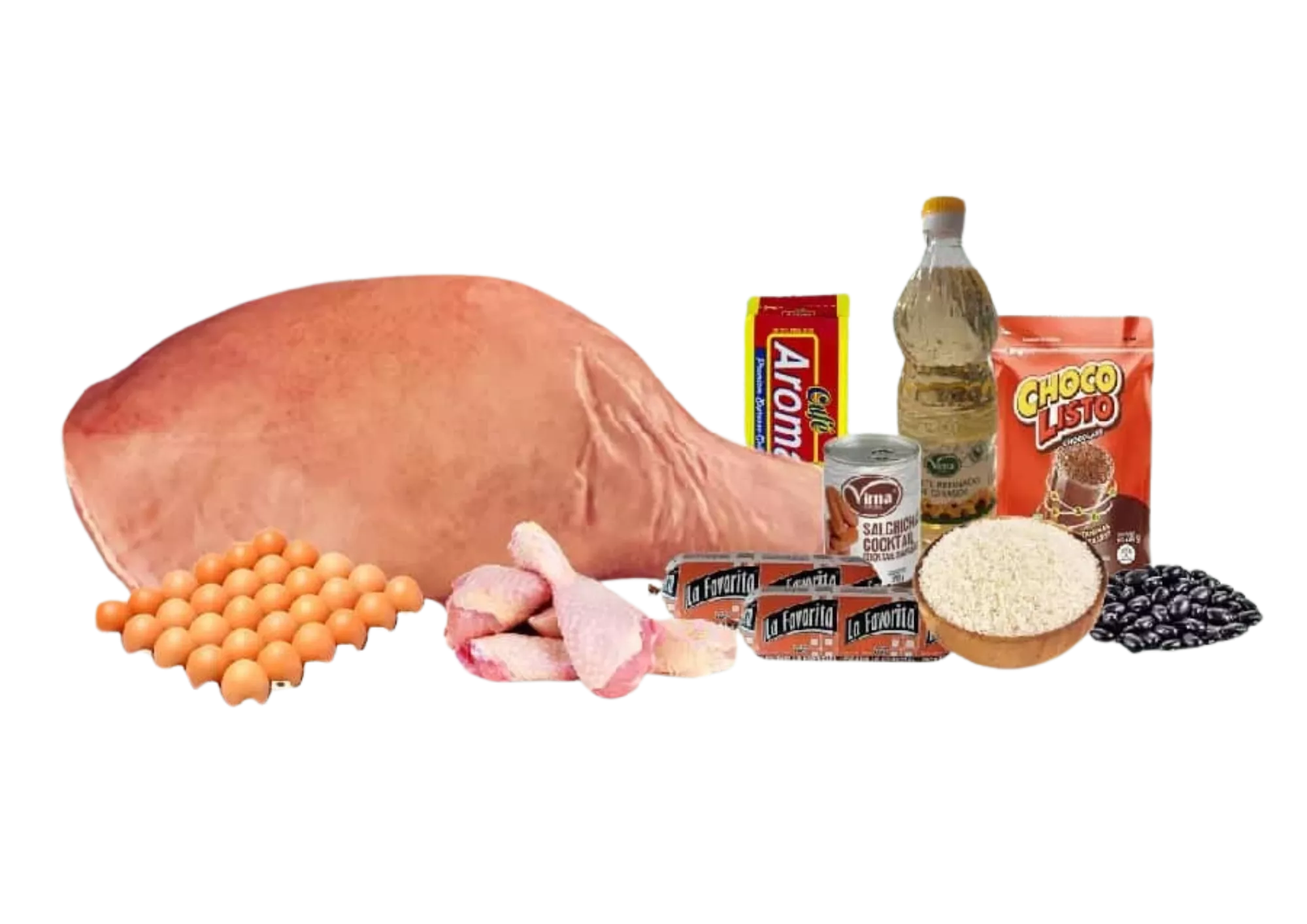 6 Carne de Cerdo (Lb) 4 Pollo (Lb) 2 Sardina en tomate (113g) 1 Salchichas (10u) 1 Cartón de huevo (30u) 6 Arroz importado (Lb) 3 Frijol negro (Lb) 1 Café Aroma (250g) 1 Aceite refinado de girasol Vima (1L) 1 Choco Listo de chocolate (400g)