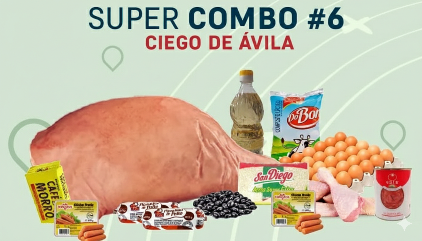 8 Carne de cerdo al corte (Lb) 1 Aceite refinado de girasol (1 L) 4 Pollo (Lb) 1 Café Morro (250 g) 2 Salchicha pollo (340 g) 1 Cartón de huevos (30 unidades) 2 Picadillo de pollo Guibon (400 g) 1 Preparado de Leche en Polvo Dobon (1 Kg) 4 Frijoles negros (Lb) 1 Tomate concentrado Sara (lata 800 g) 1 Arroz Super extra San Diego (1 kg)